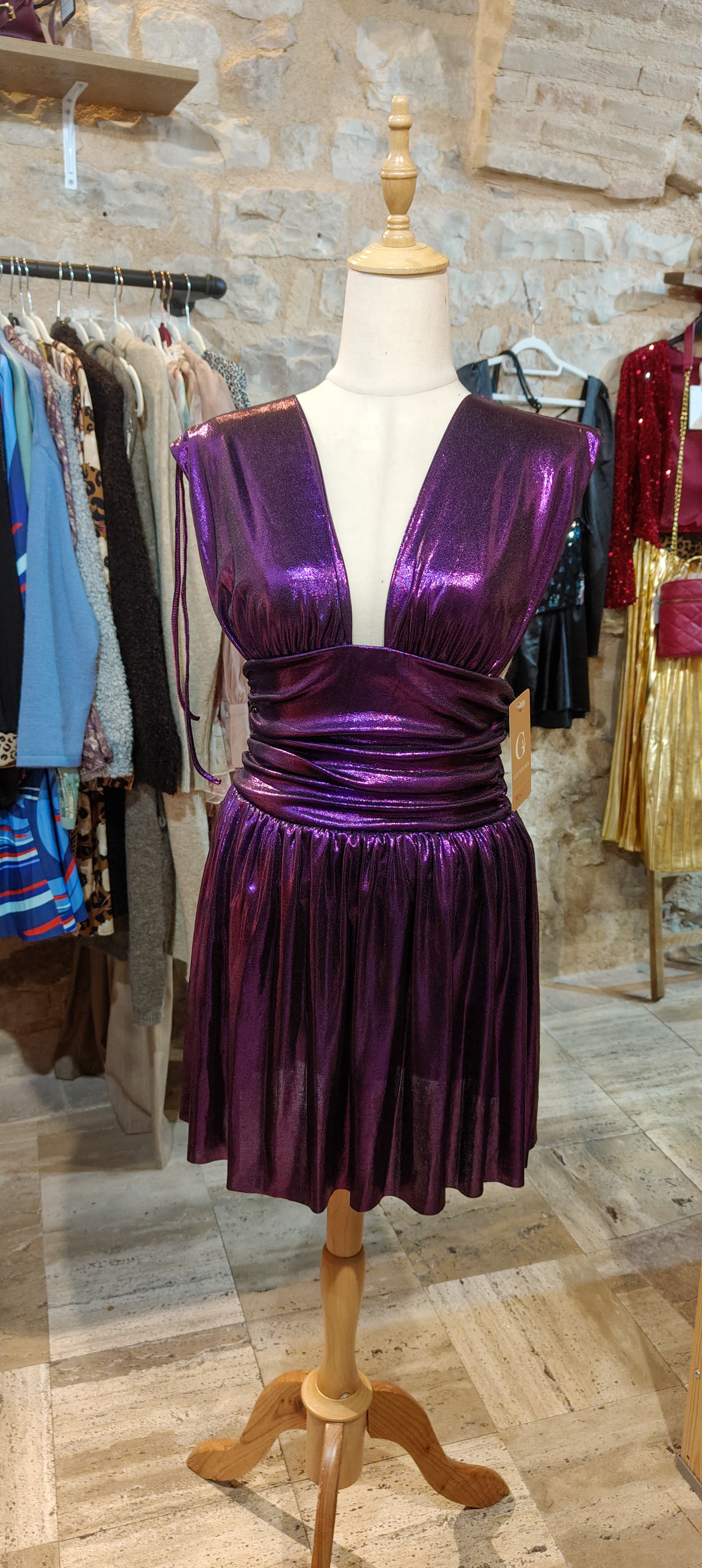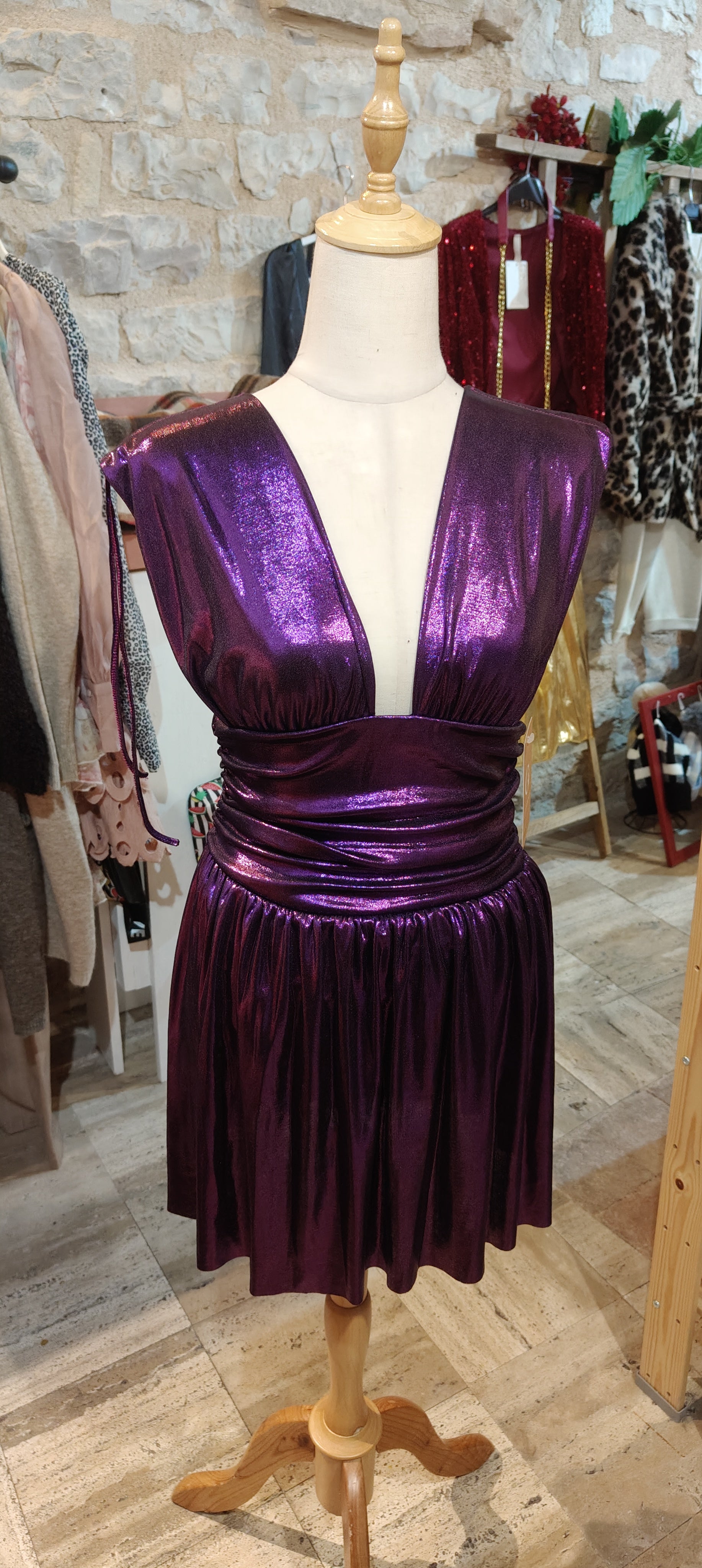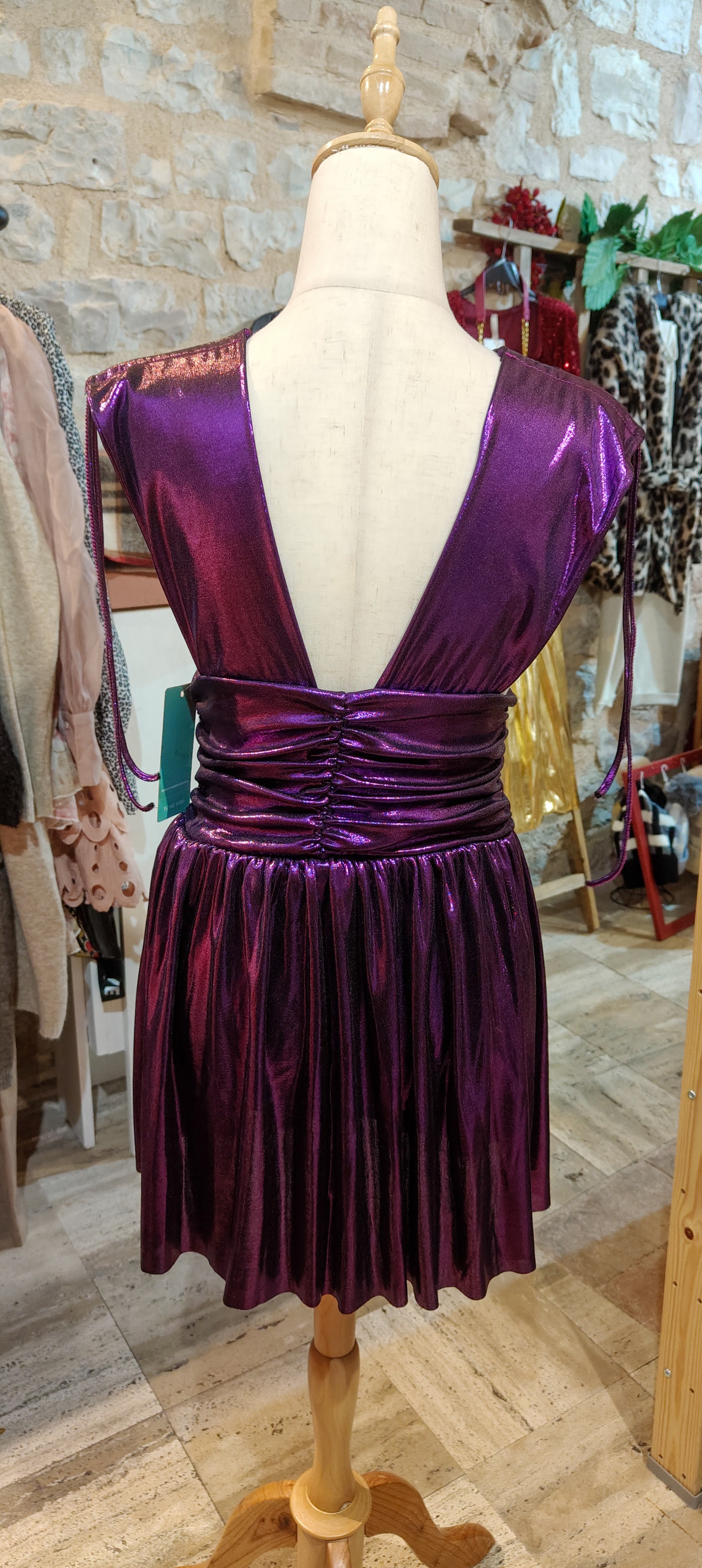 Abito metallizzato viola composto da due fasce che coprono il seno e un gonnellino. Sotto la gonna c'è una sottogonna a pantalone