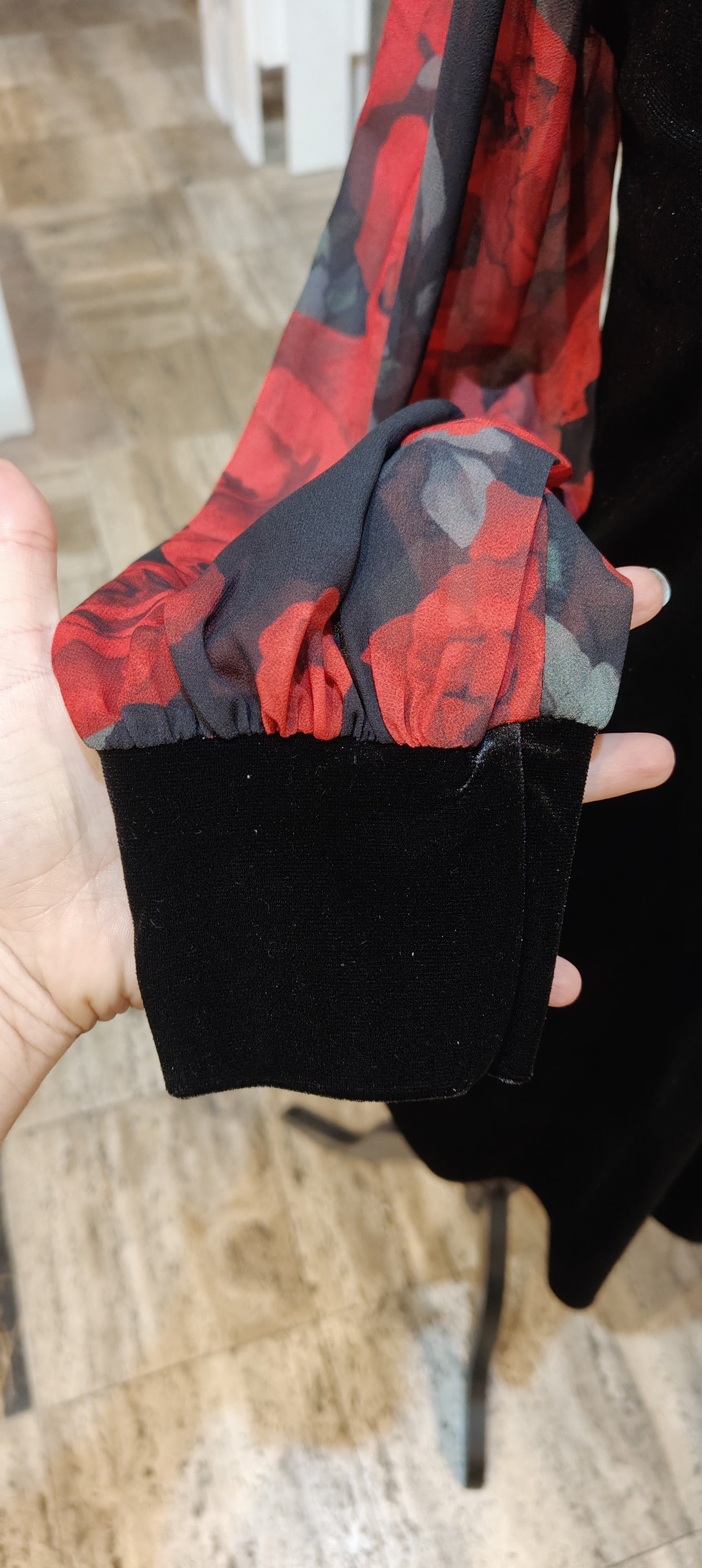 Abito lungo fino al ginocchio in velluto, con manica e collo con tessuto floreale semi trasparente