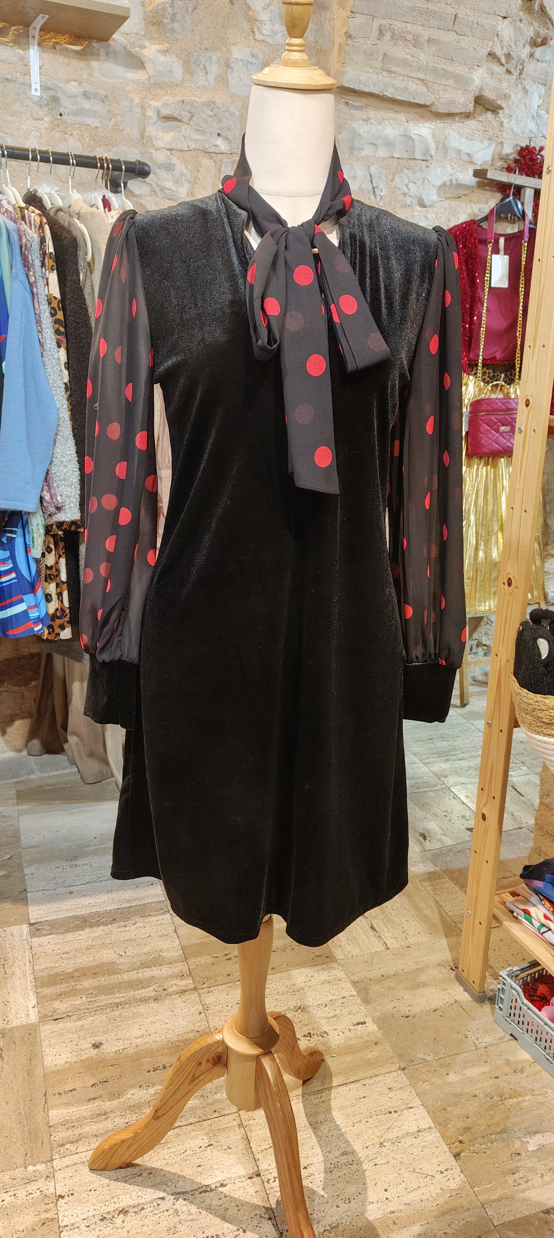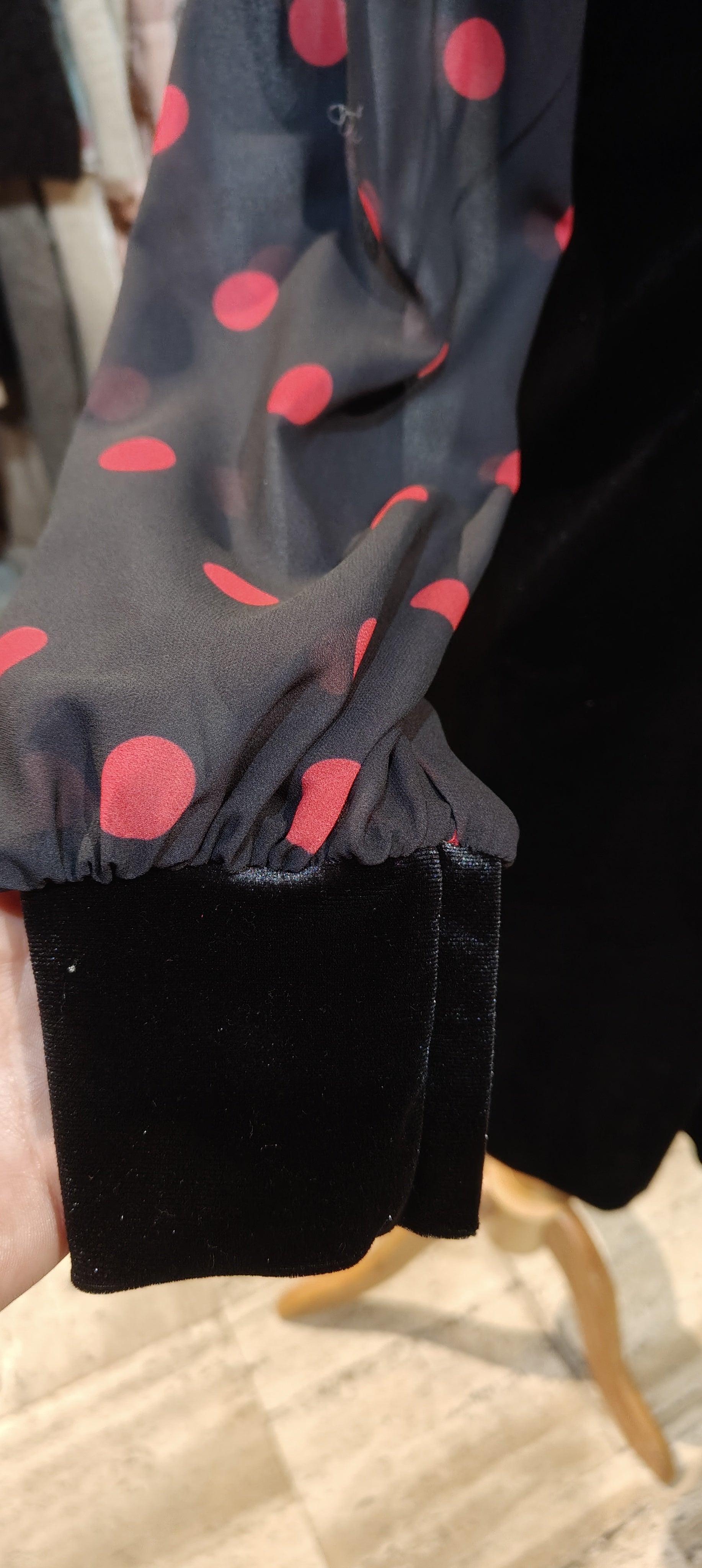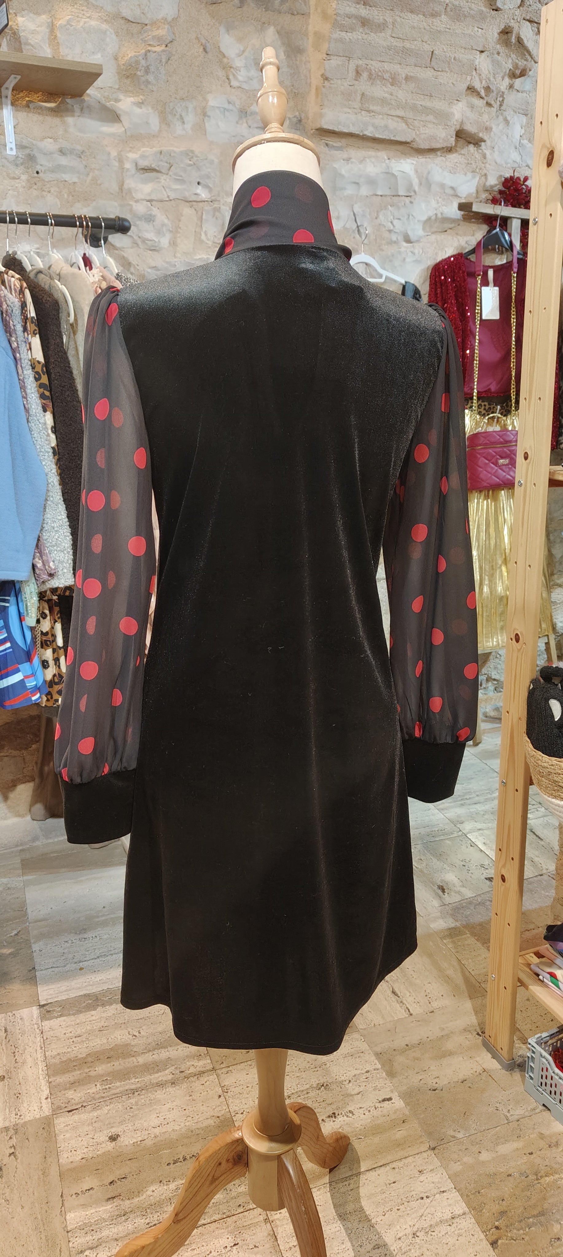 Abito lungo fino al ginocchio in velluto, con manica e collo con tessuto a pois semi trasparente