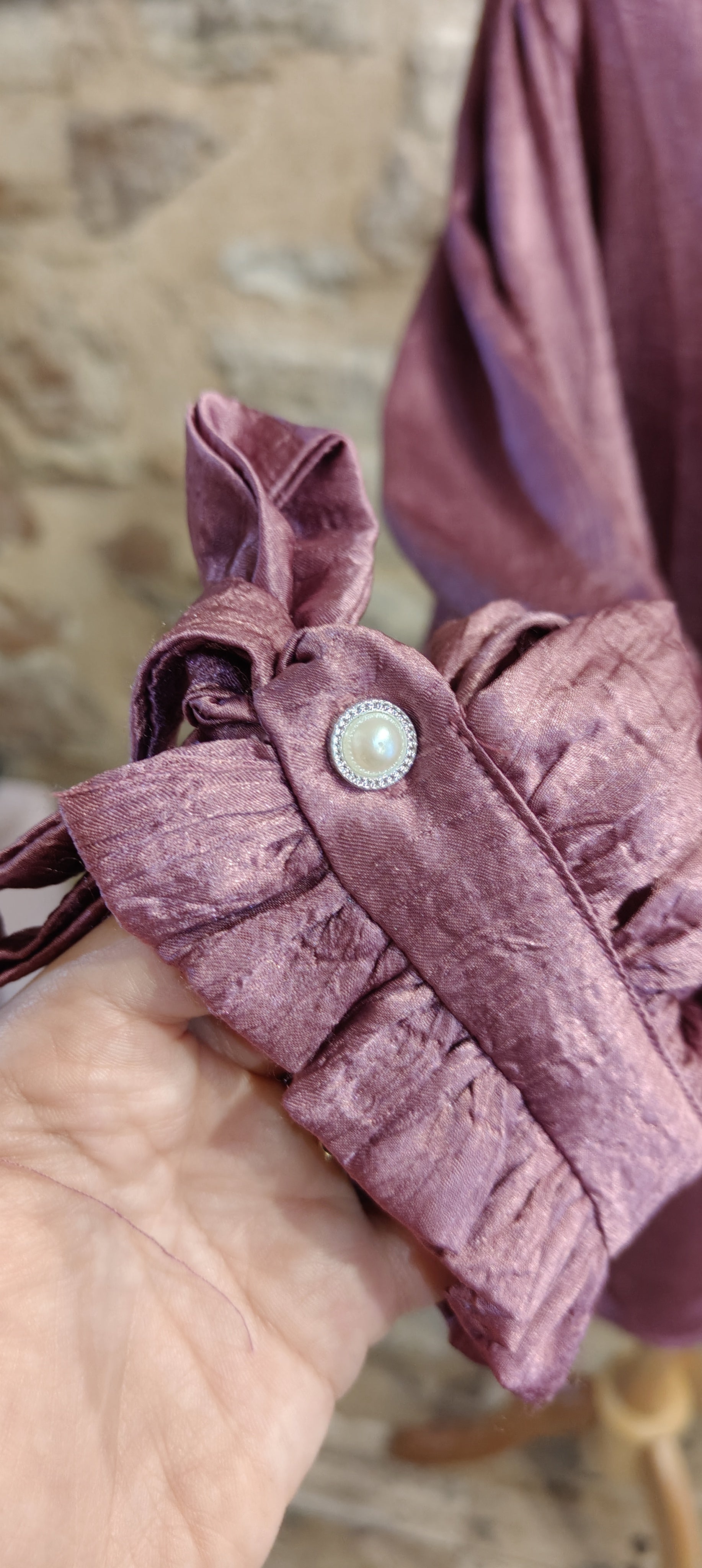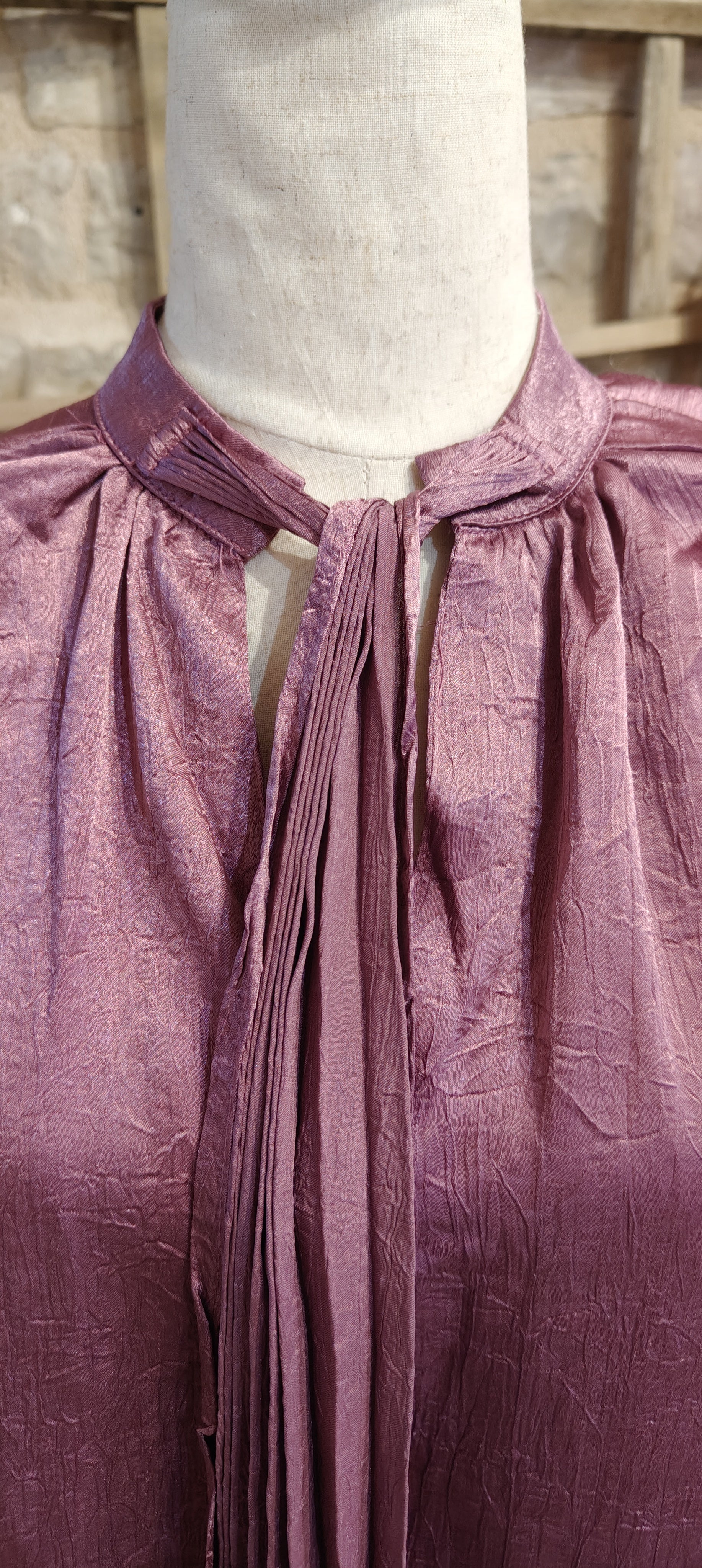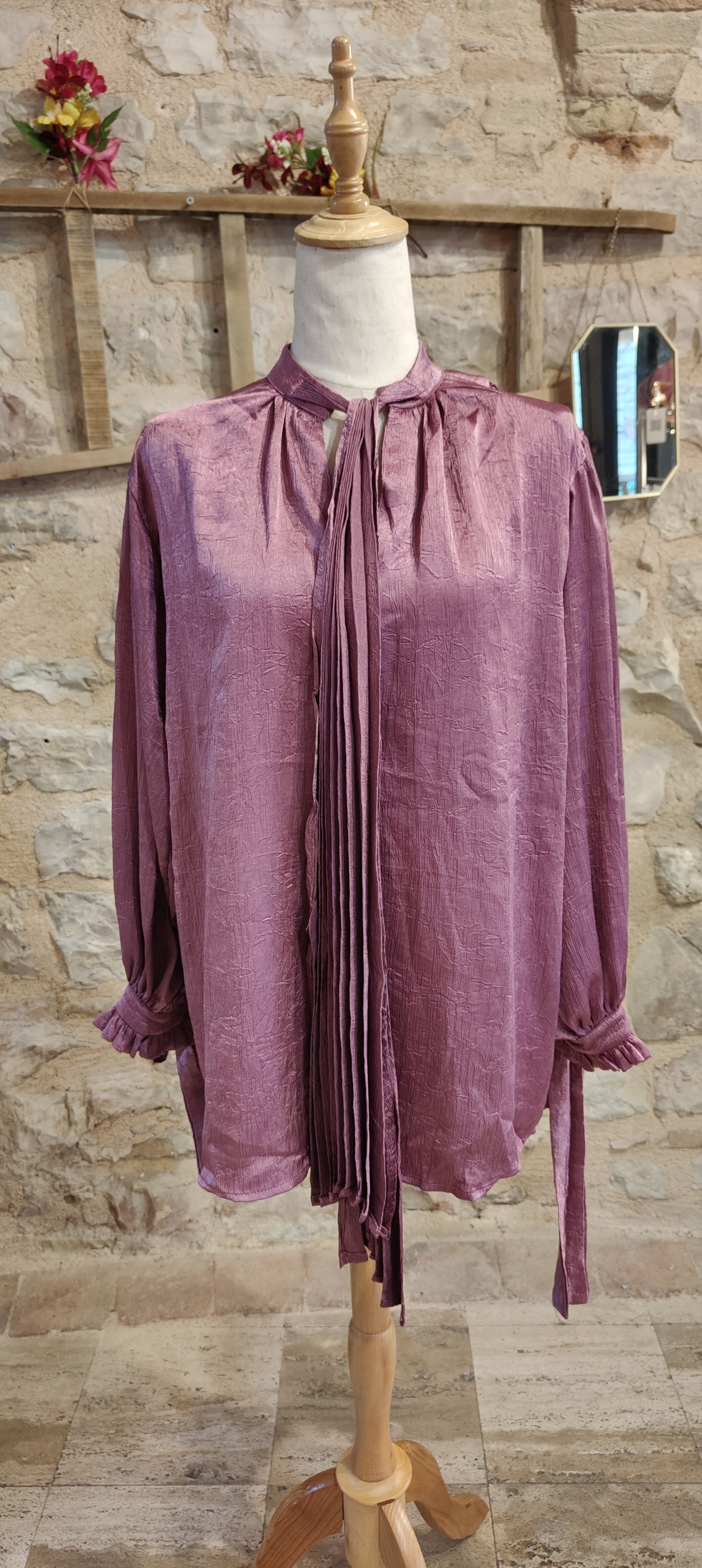 Magnifica blusa con fiocco plissettato avanti e nastri sulle maniche