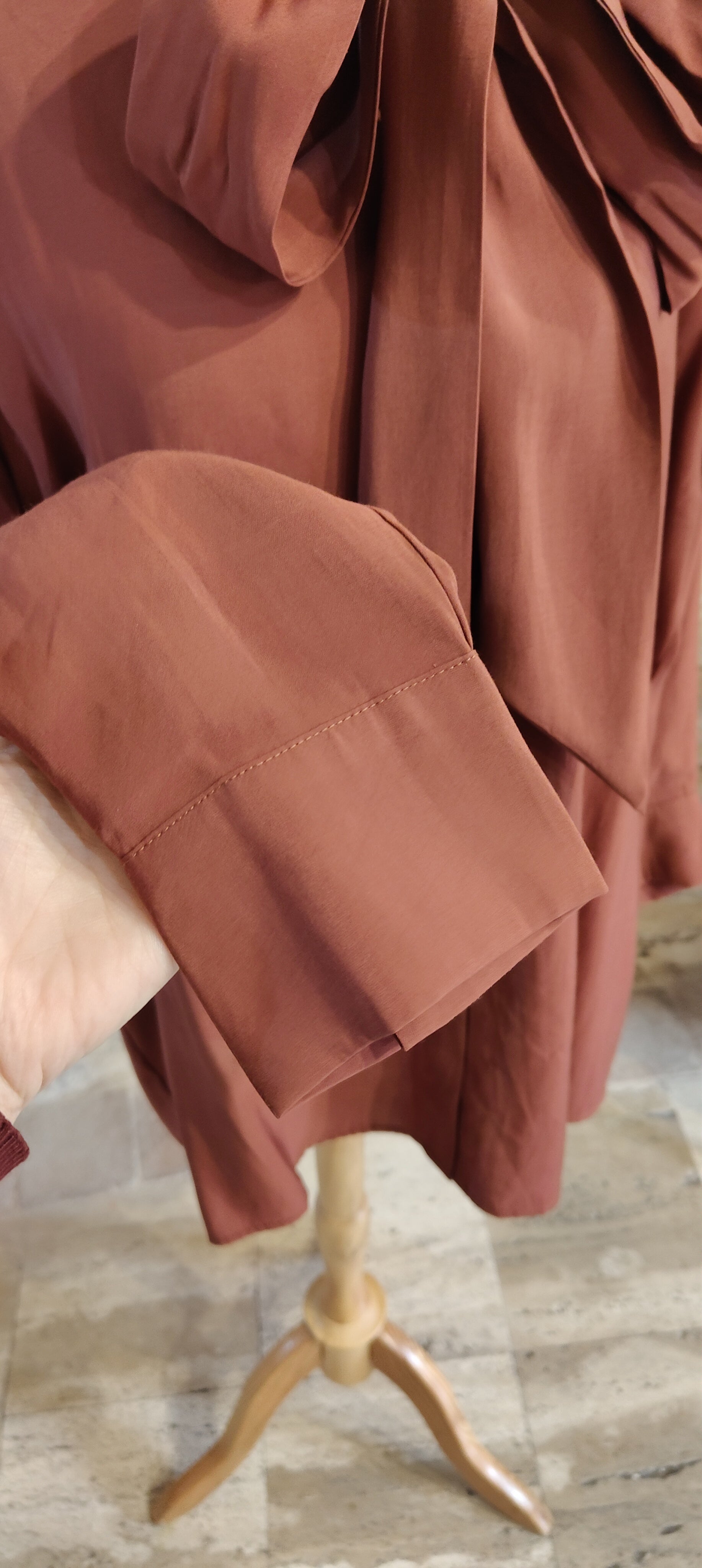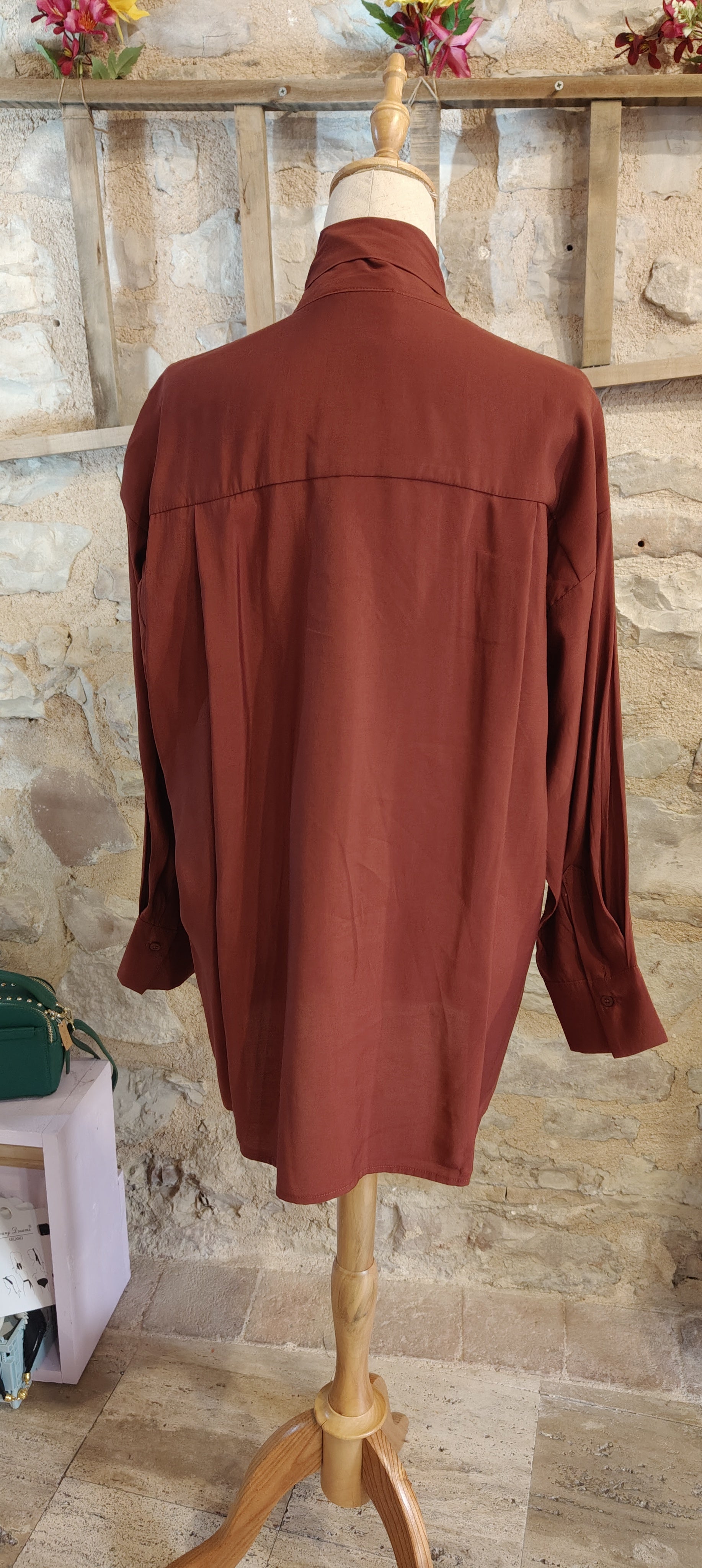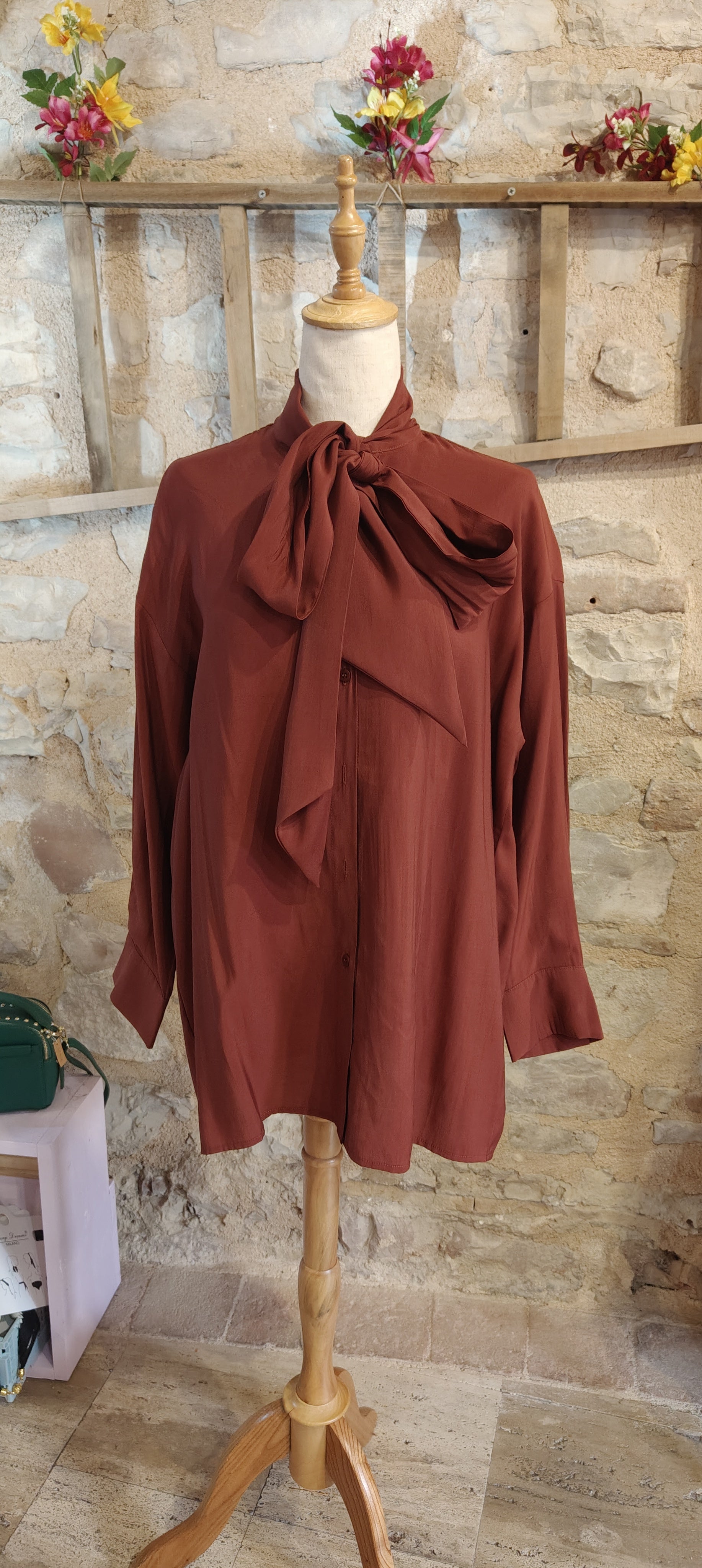 Camicia tessuto pesca, morbidissima, con nastro sul colletto per fare un fiocco. Ha due piegature dietro per rendere la vestibilità ancora più versatile