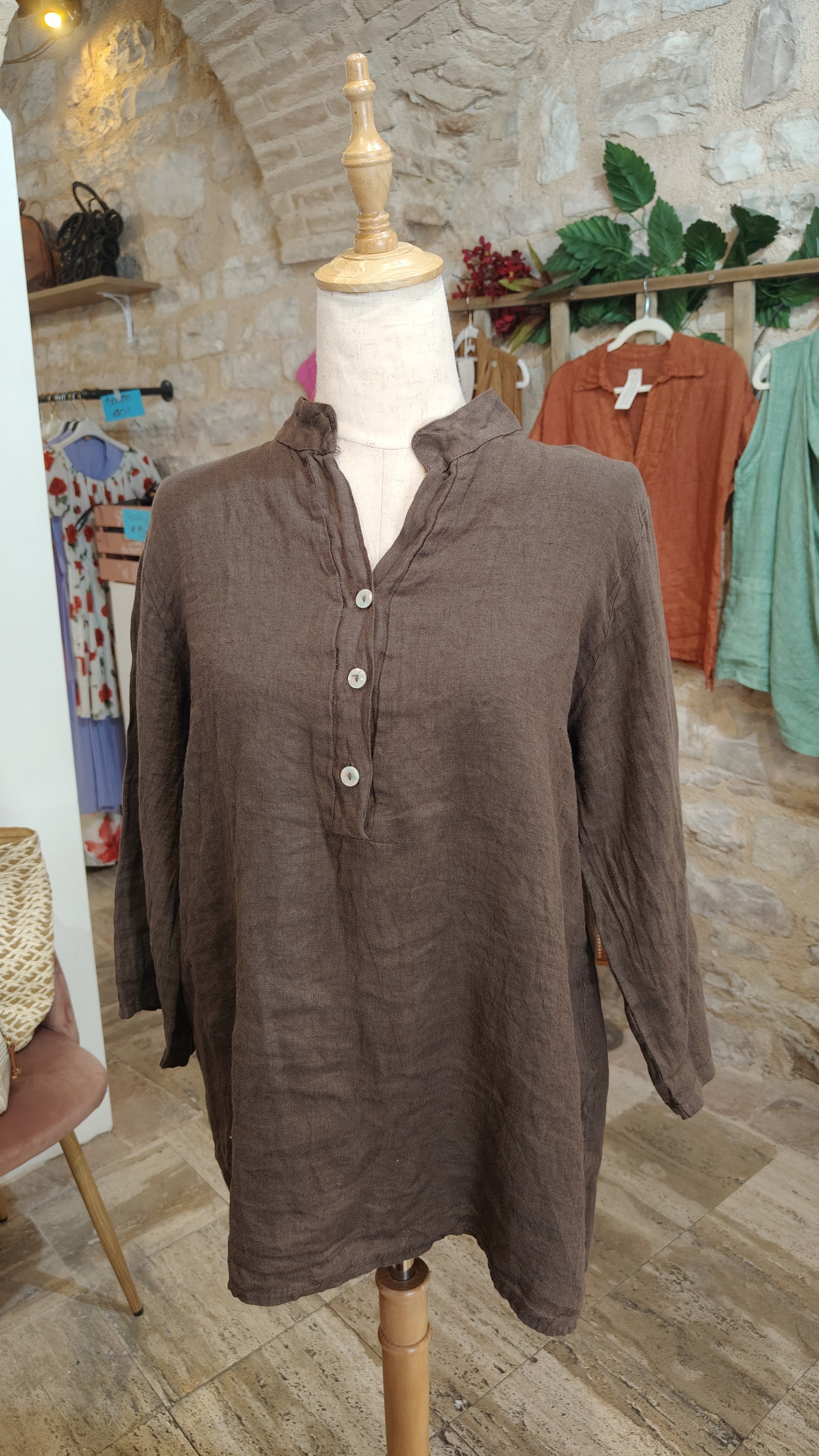 Camicia lino marrone con manica 3/4, leggermente svasata sul dietro. Scollo coreano e bottoni madreperla