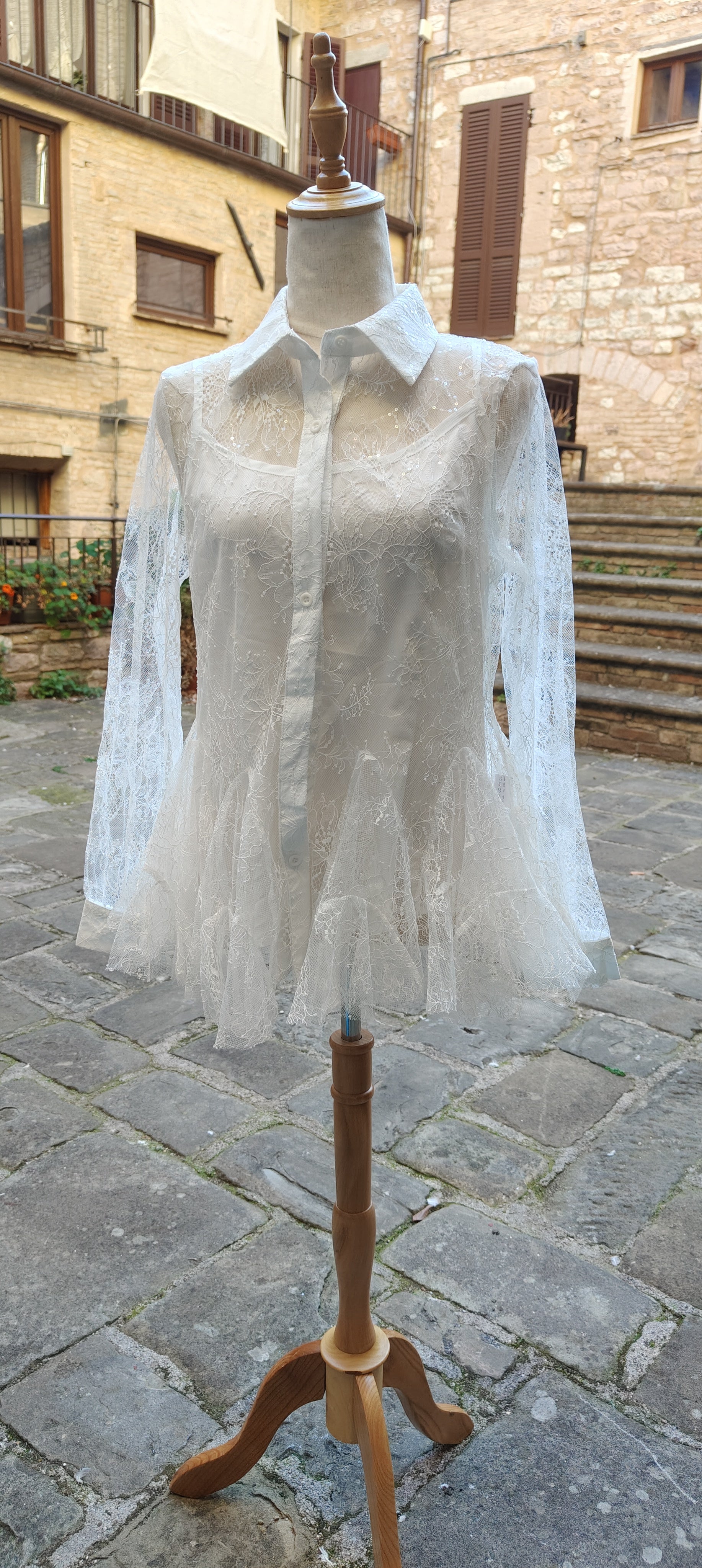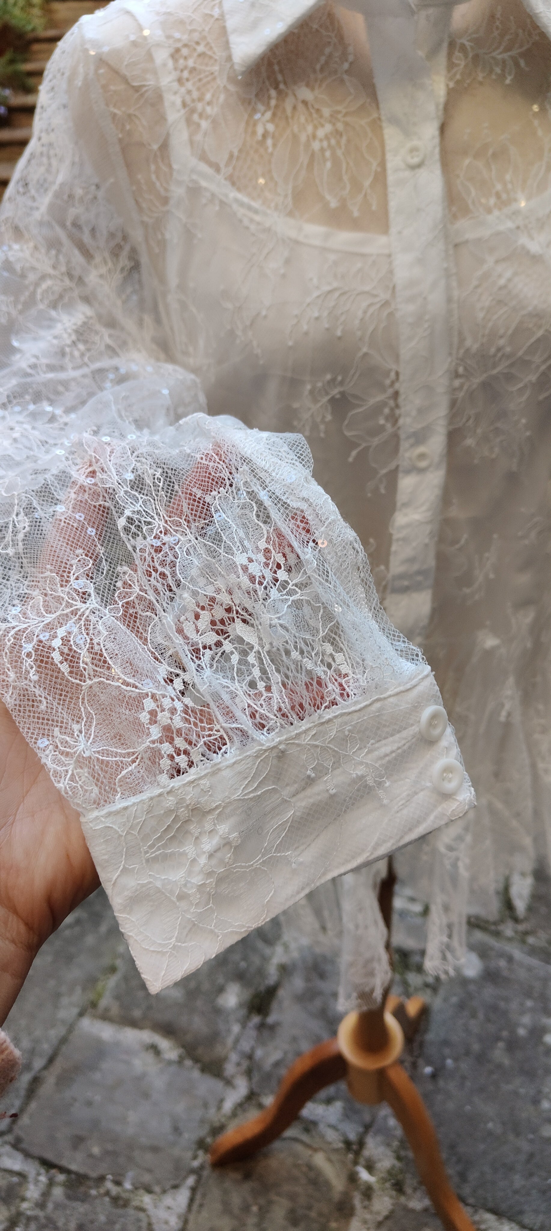 Camicia in pizzo impreziosito da paillettes, effetto trasparente, con canottiera