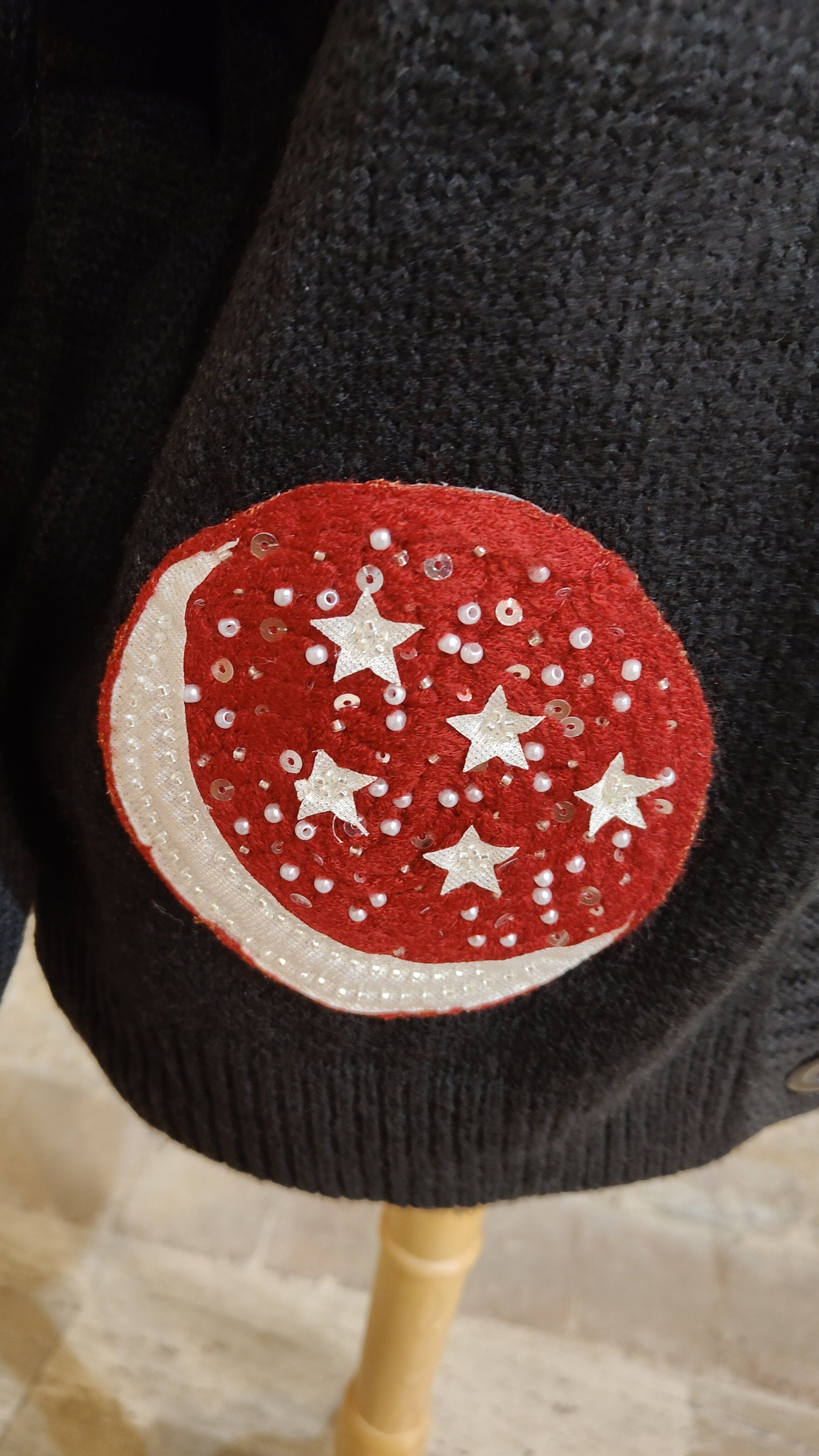 Cardigan con applicazioni a tema universo, impreziosite da perline e strass. Si chiuse con i bottoni
