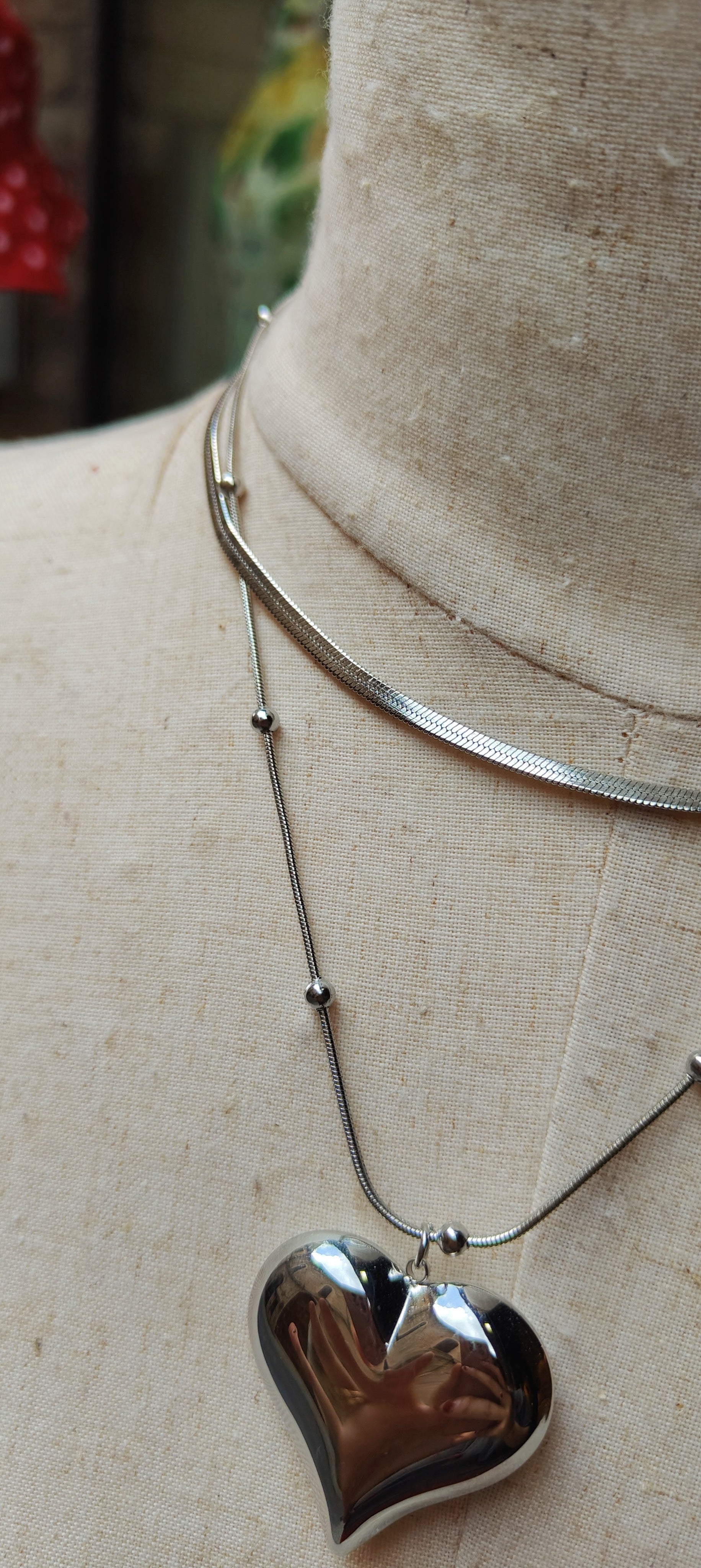 Collana in acciaio inossidabile con doppio filo e cuore bombato
