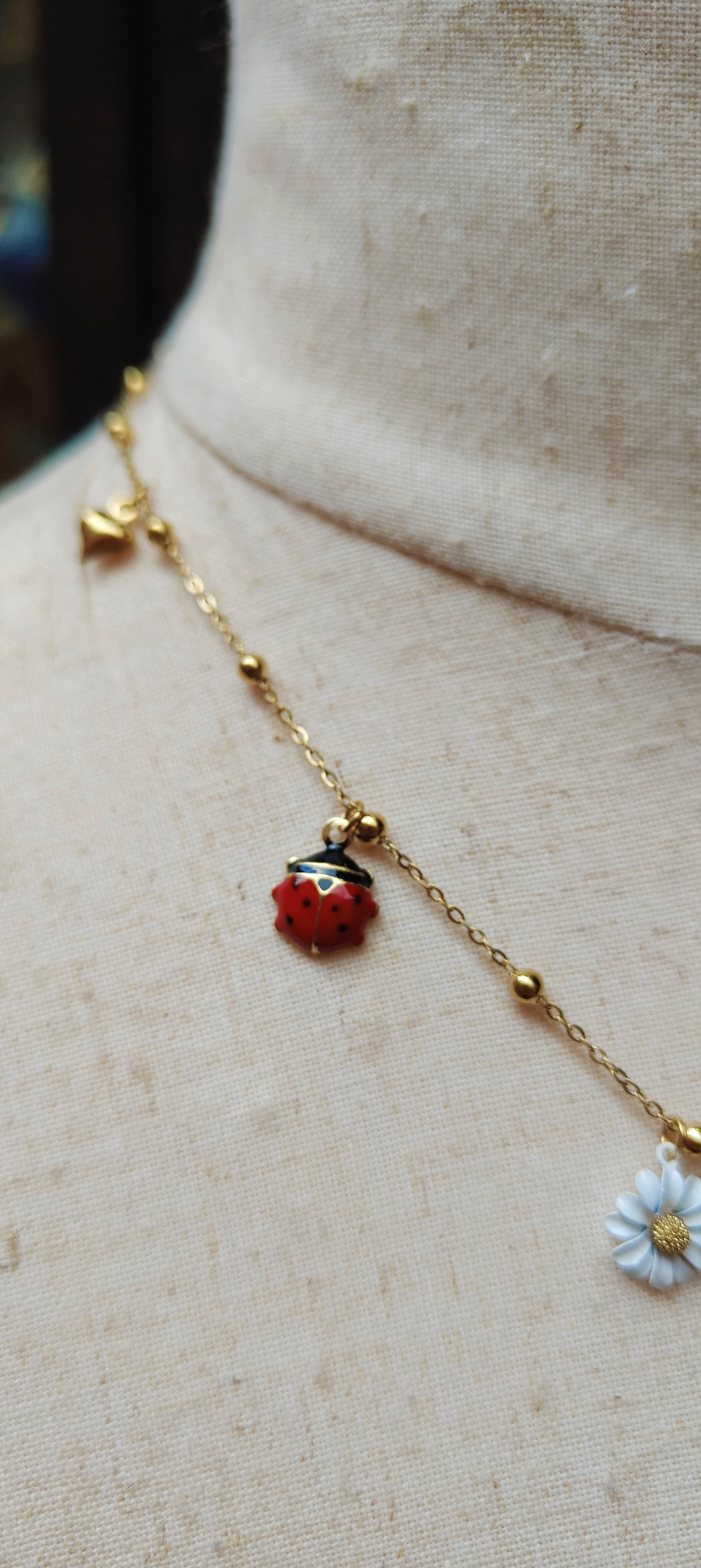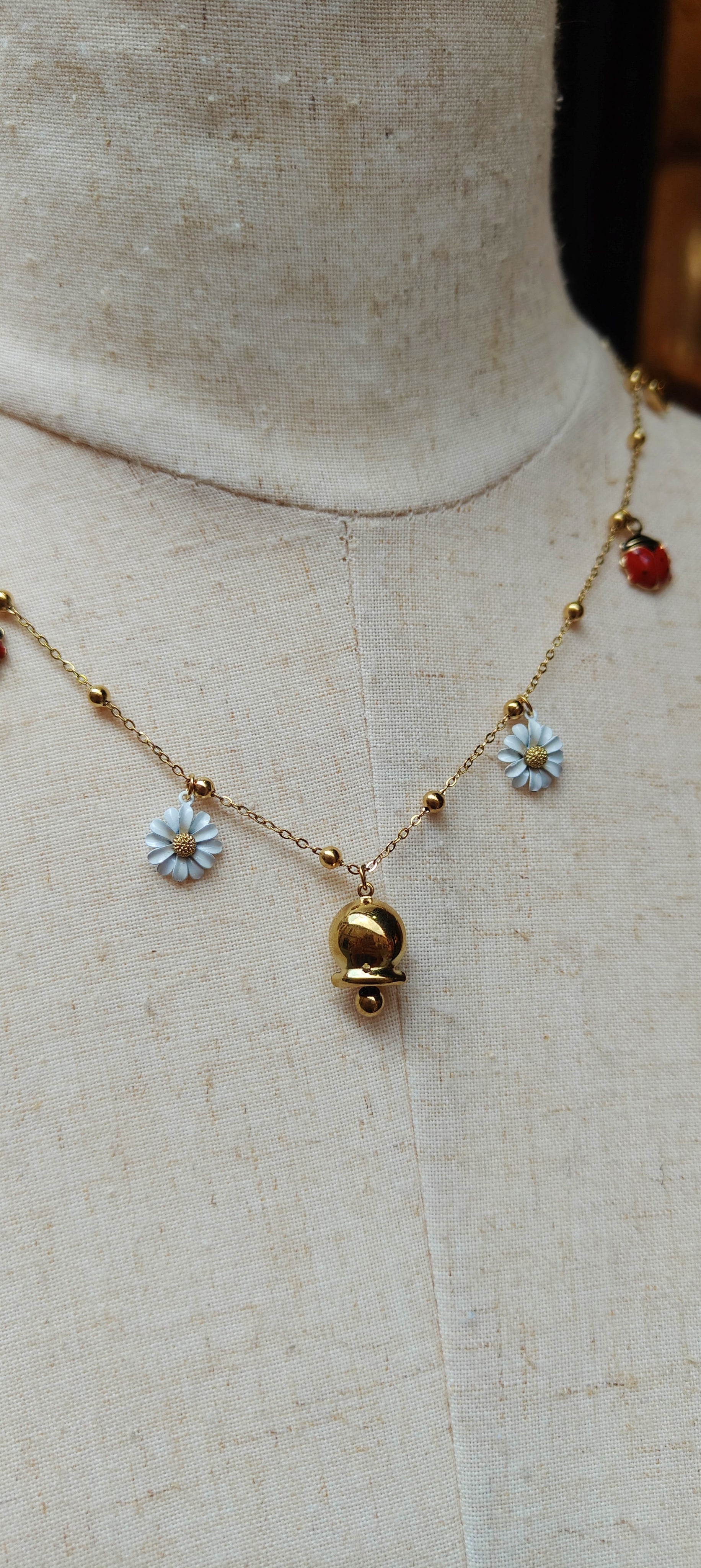 Collana in acciaio inossidabile con margherite, coccinelle e una campanella al centro
