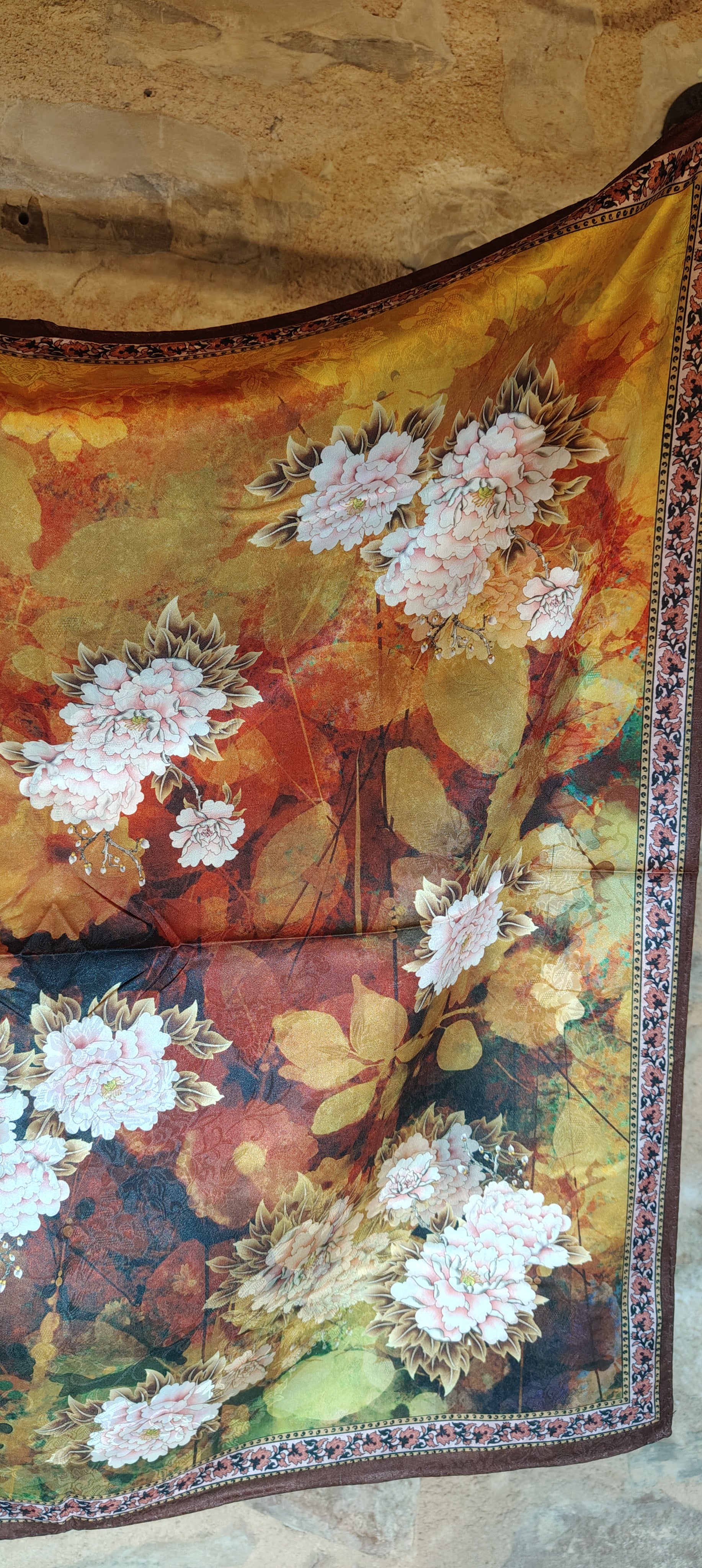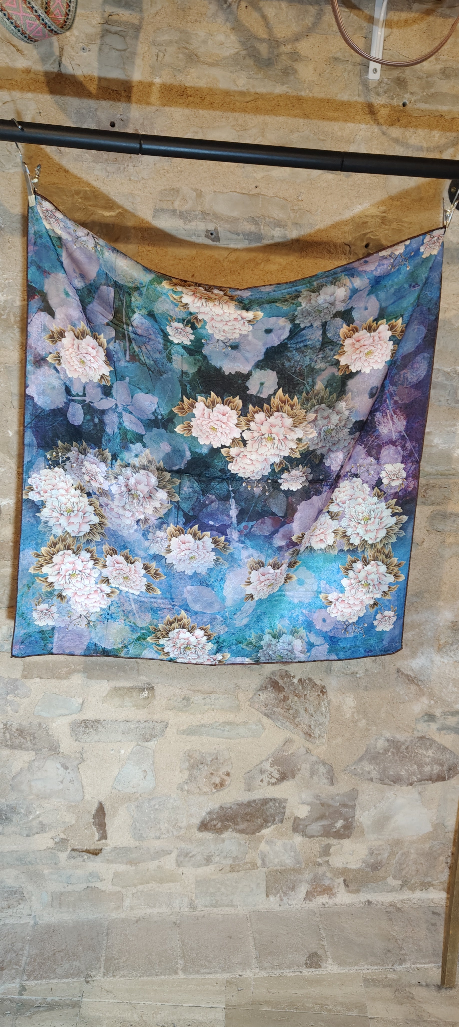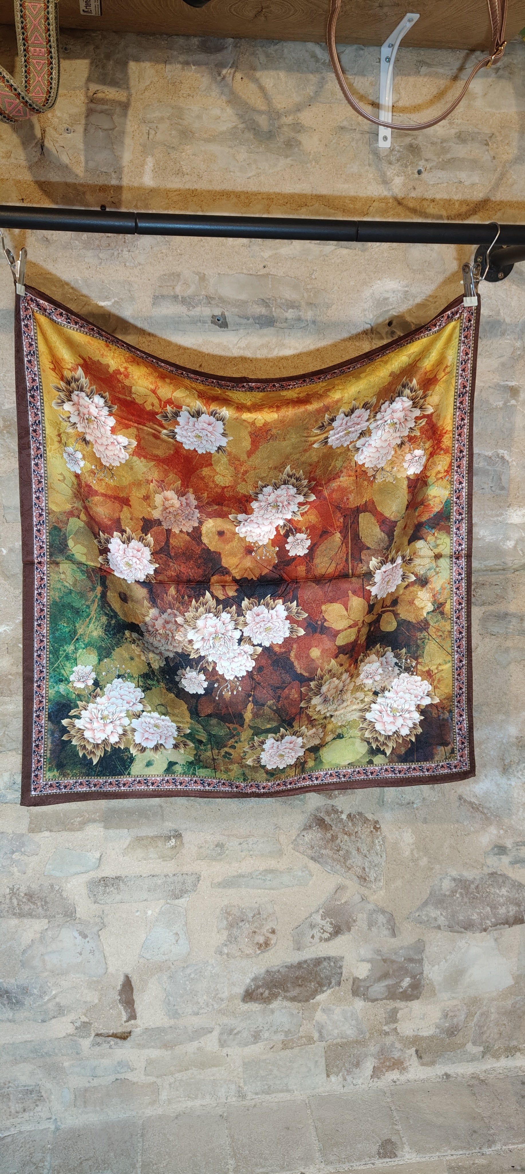Foulard 75x75 circa, in viscosa e seta. Entrambi lati del foulard presentano disegni diversi