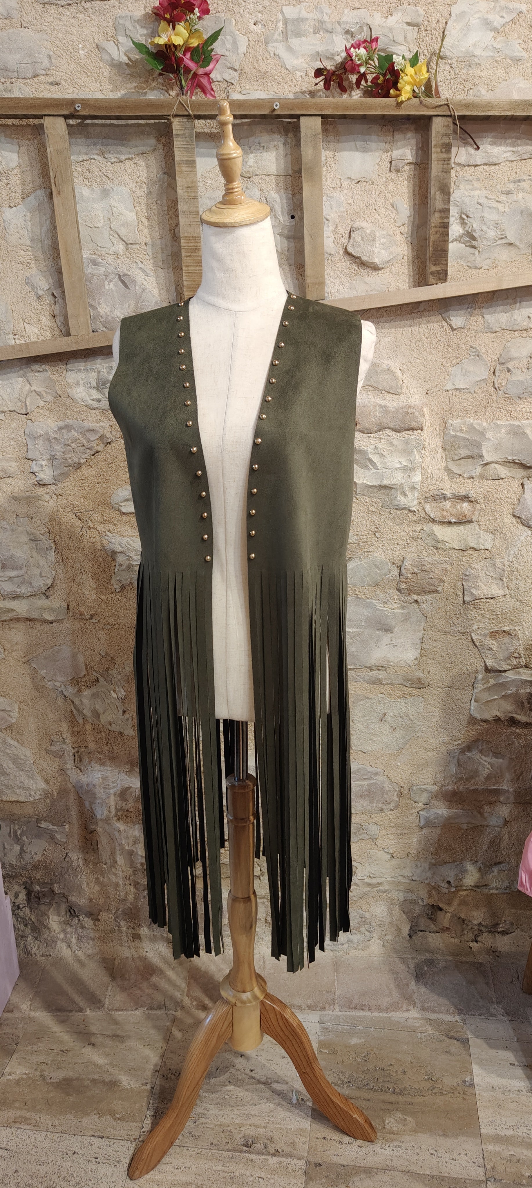 Gilet sfrangiato lungo, tessuto scamosciato, con bulloni dorati a impreziosire. Senza bottoni, rimane aperto per adattarsi a ogni fisico