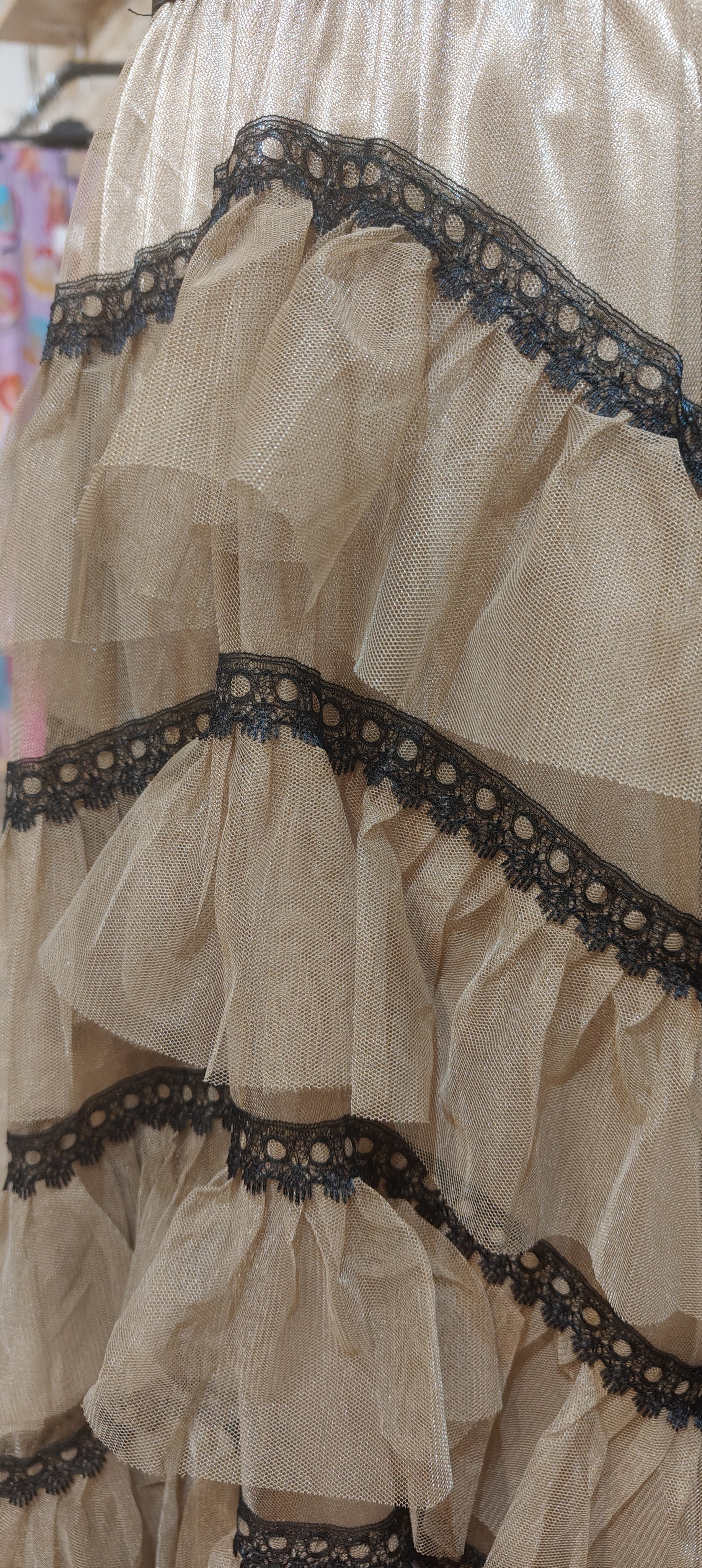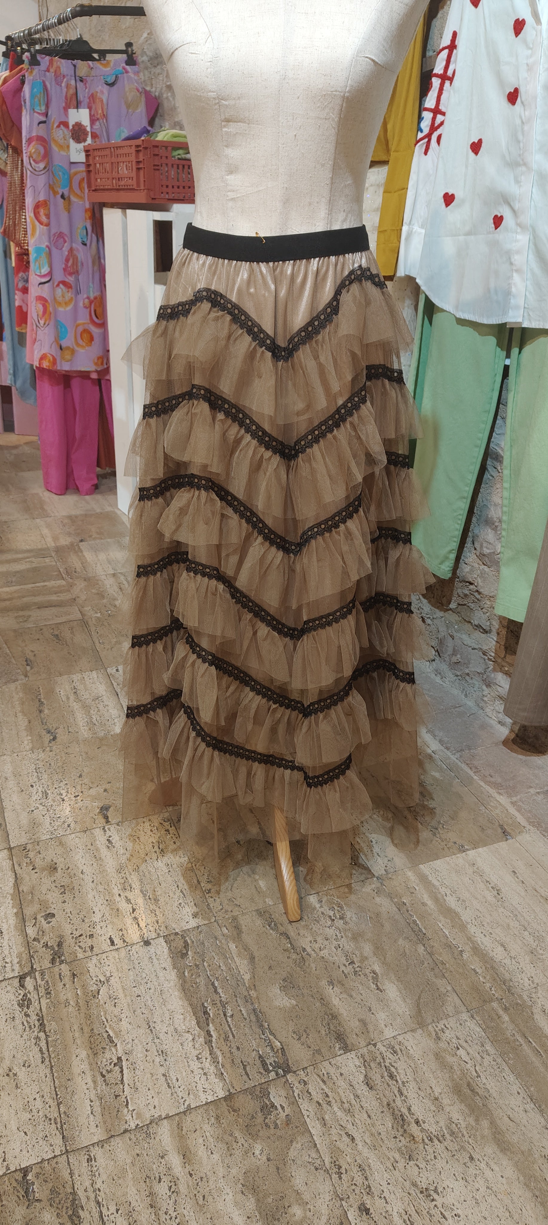 Gonna a balze in tulle color marrone e con merletto nero, elastico in vita