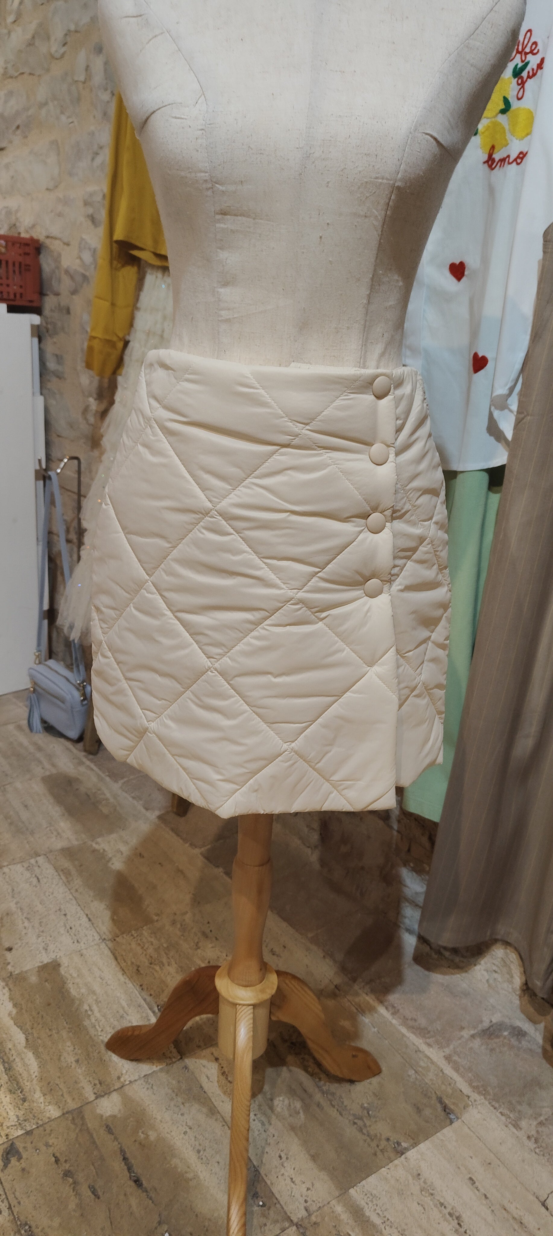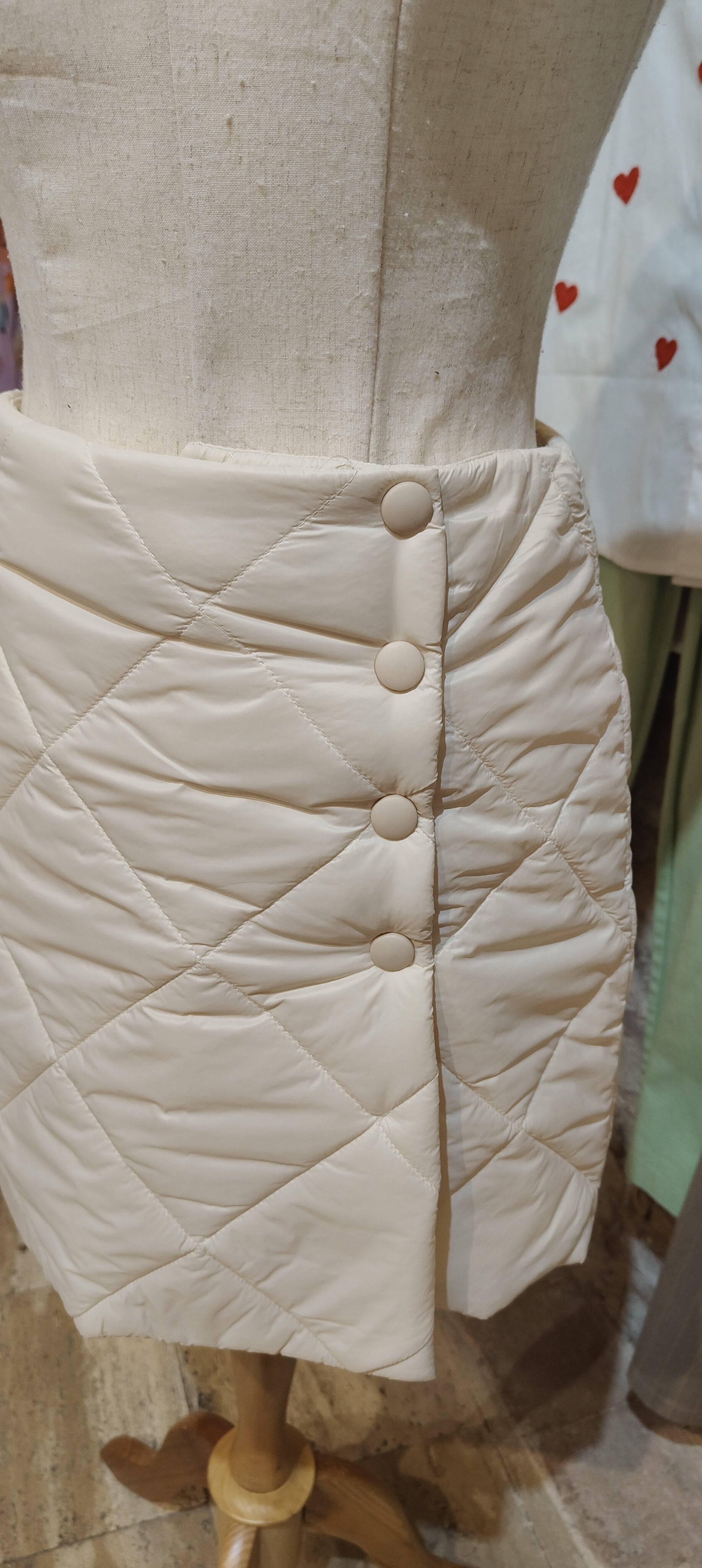 Particolare gonna a portafoglio, con bottoni automatici per chiuderla e la particolarità sta nel tessuto a piumino