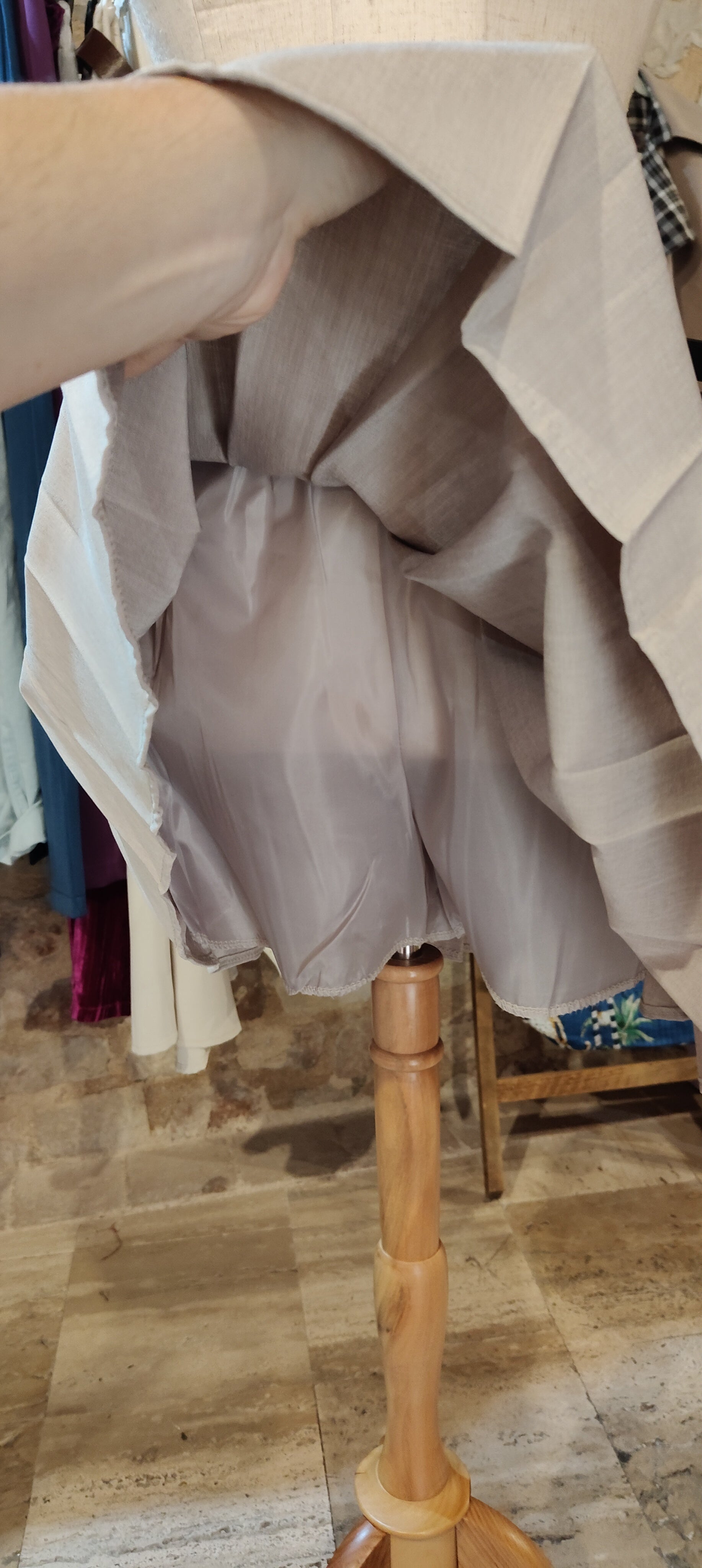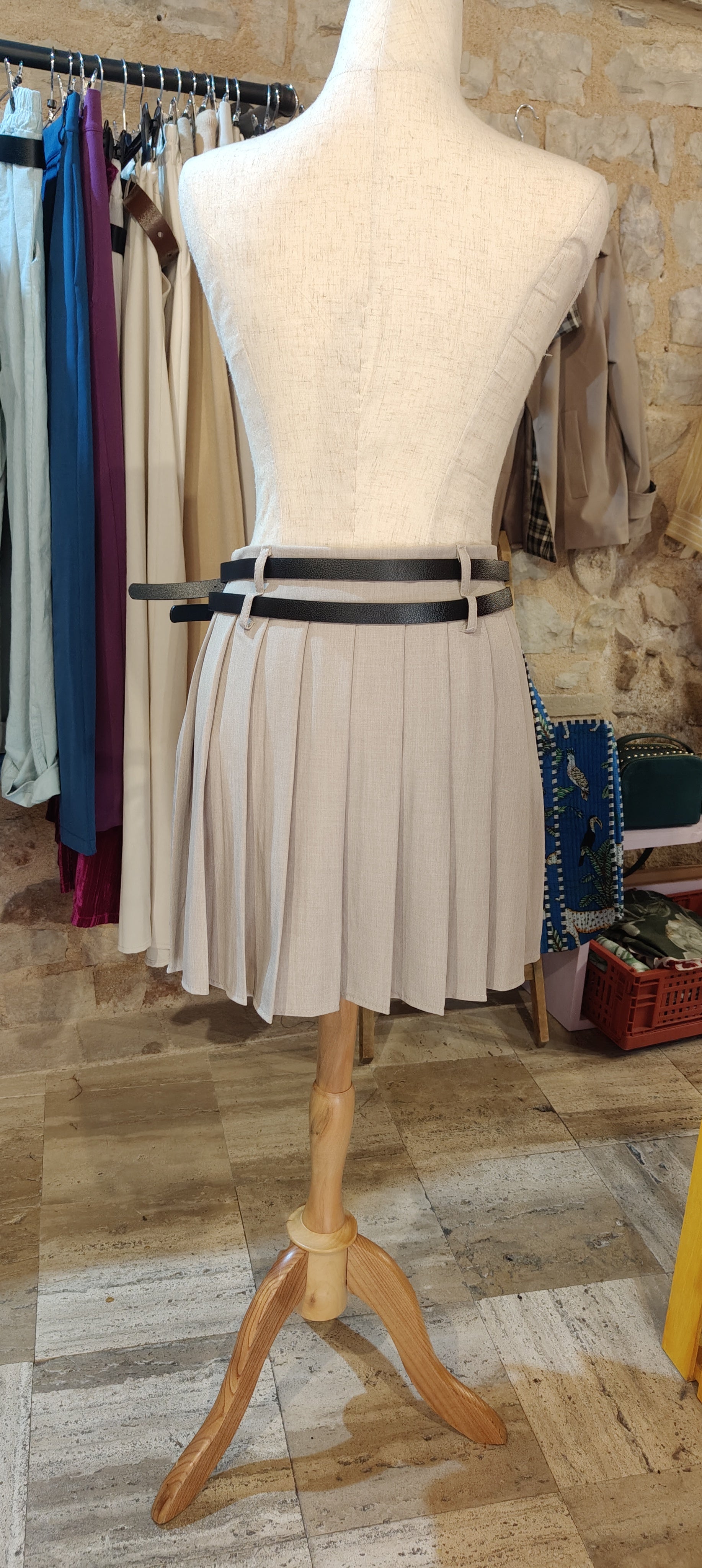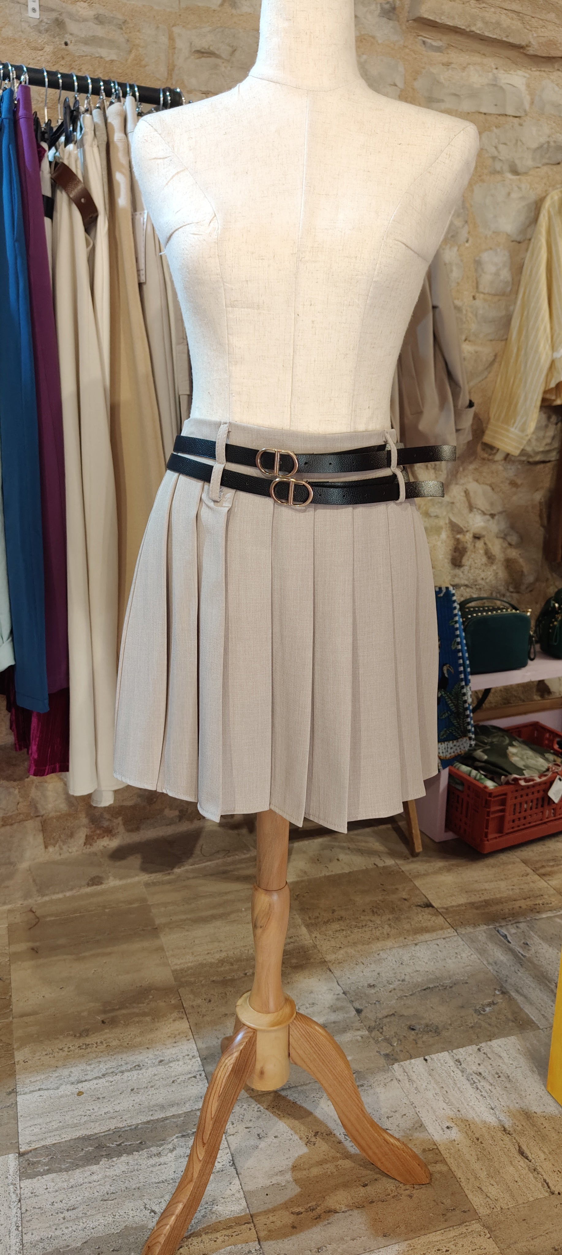 Gonna plissettata con doppia cintura e zip invisibile. È foderata con una pantaloncino