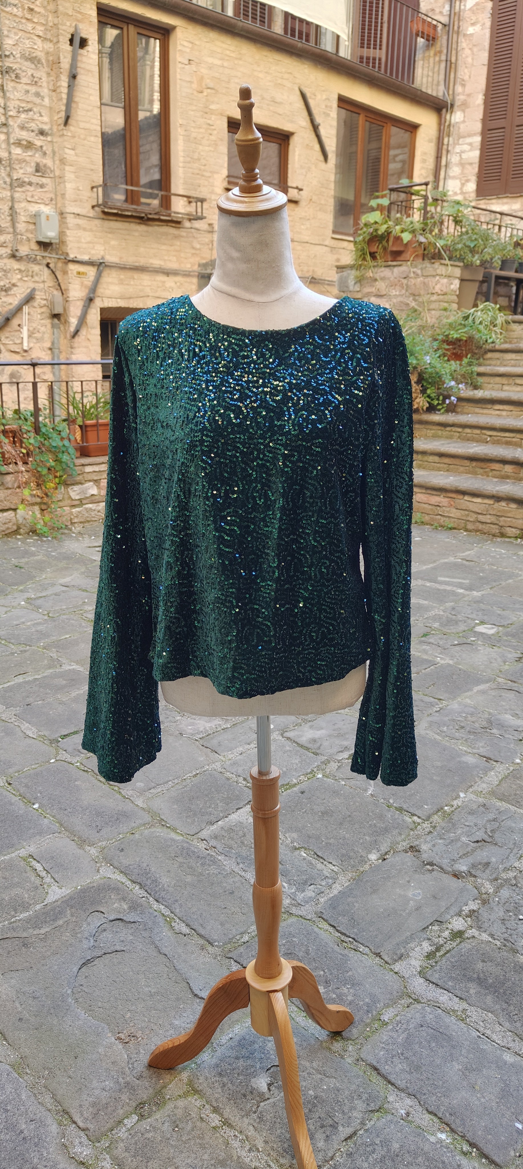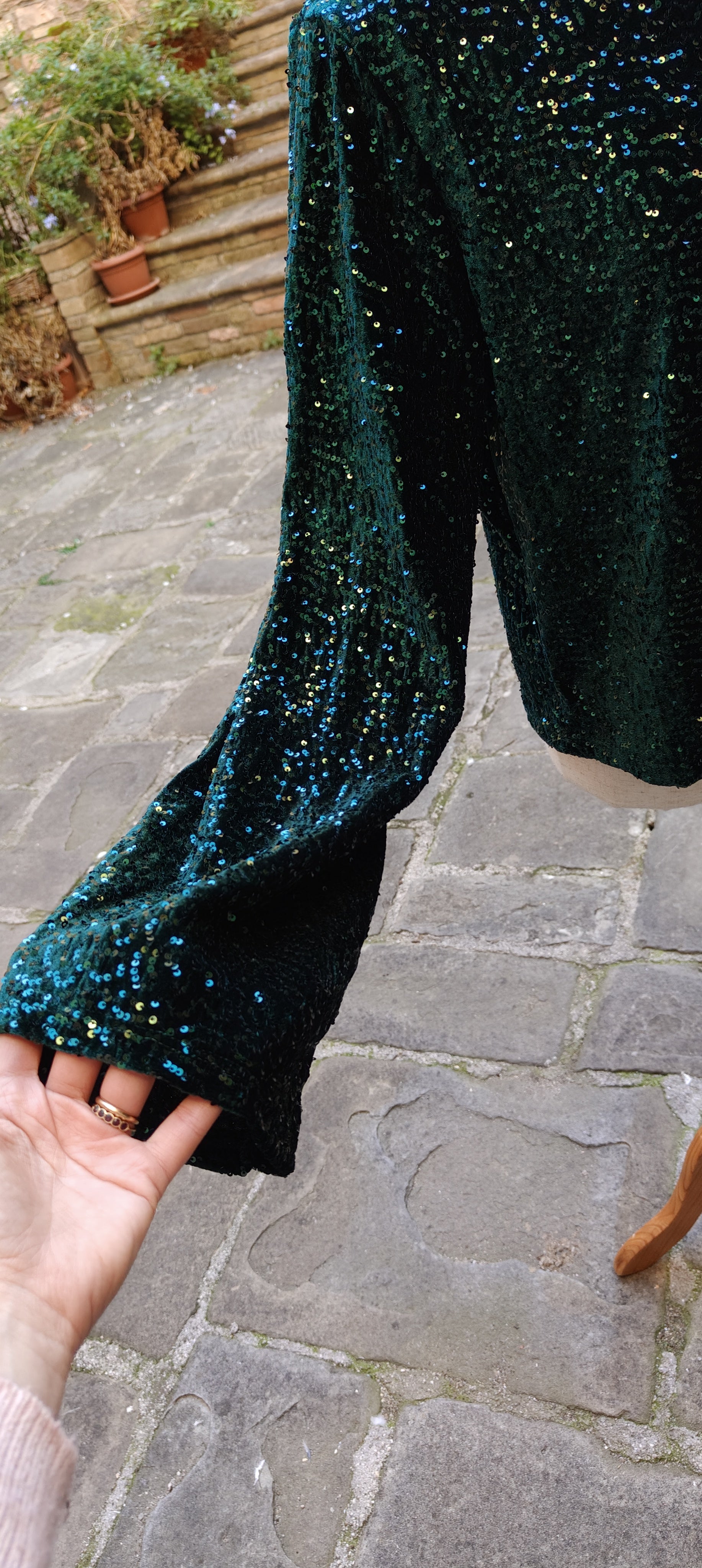 Maglia in velluto verde con chiusura diesto con fioco. Il tessuto è impreziosito da paillettes