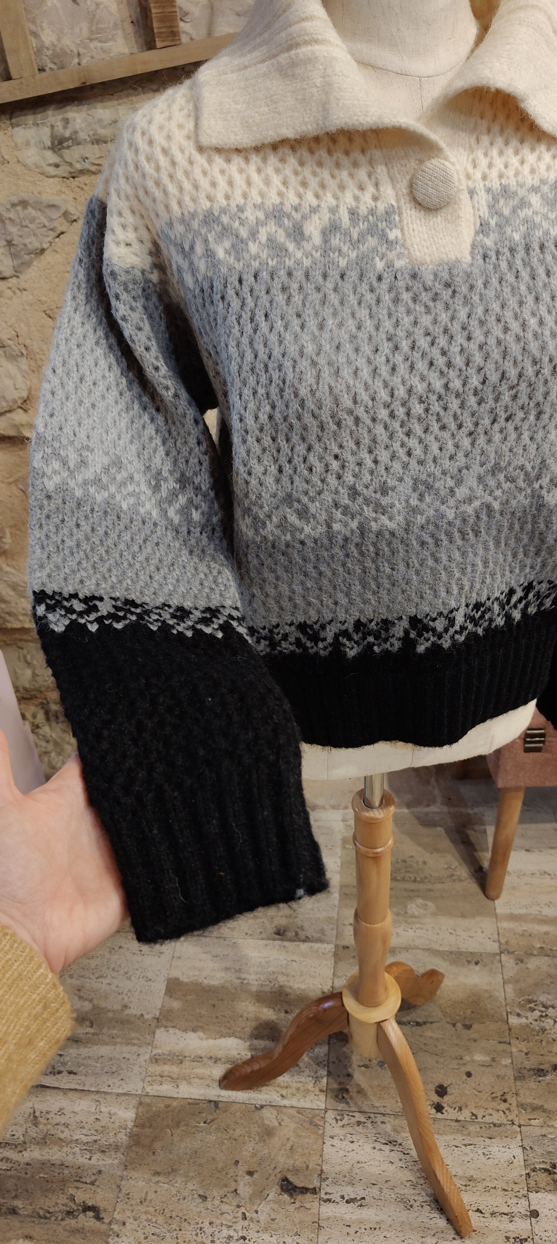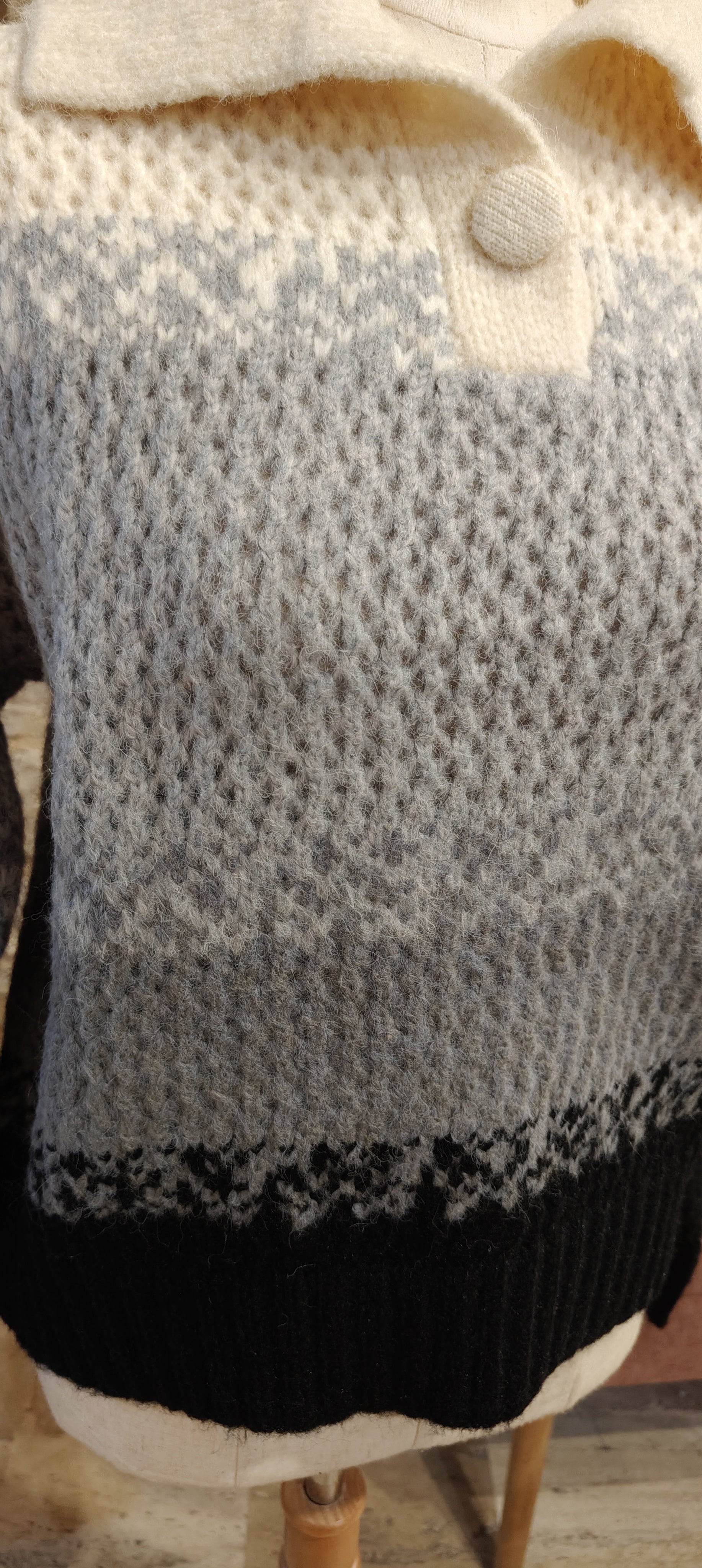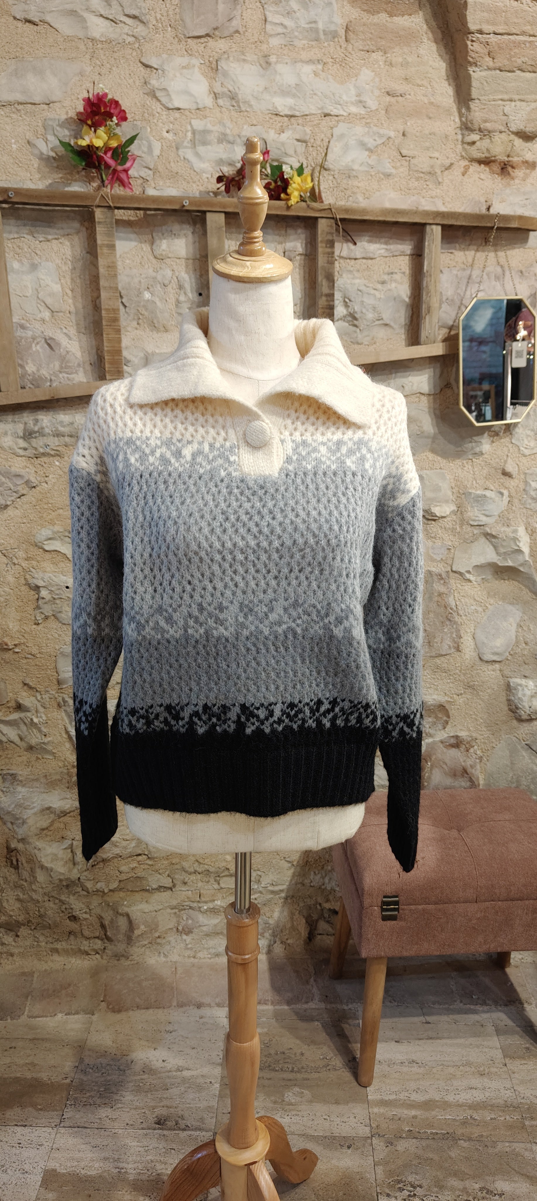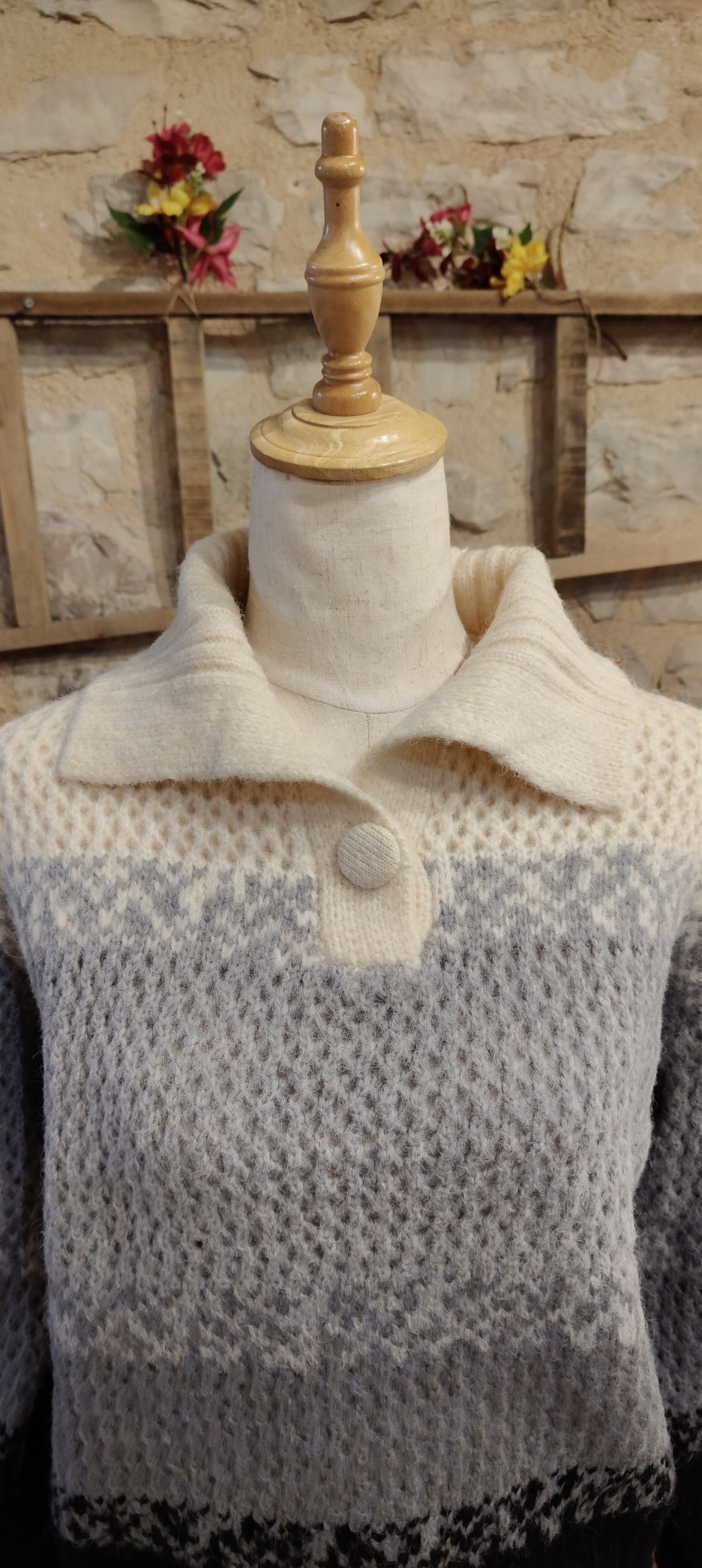 Maglioncino a tricolore sfumato, molto caldo, con colletto e bottone in tessuto. Il tessuto è elastico e lunghezza poco sotto la vita.