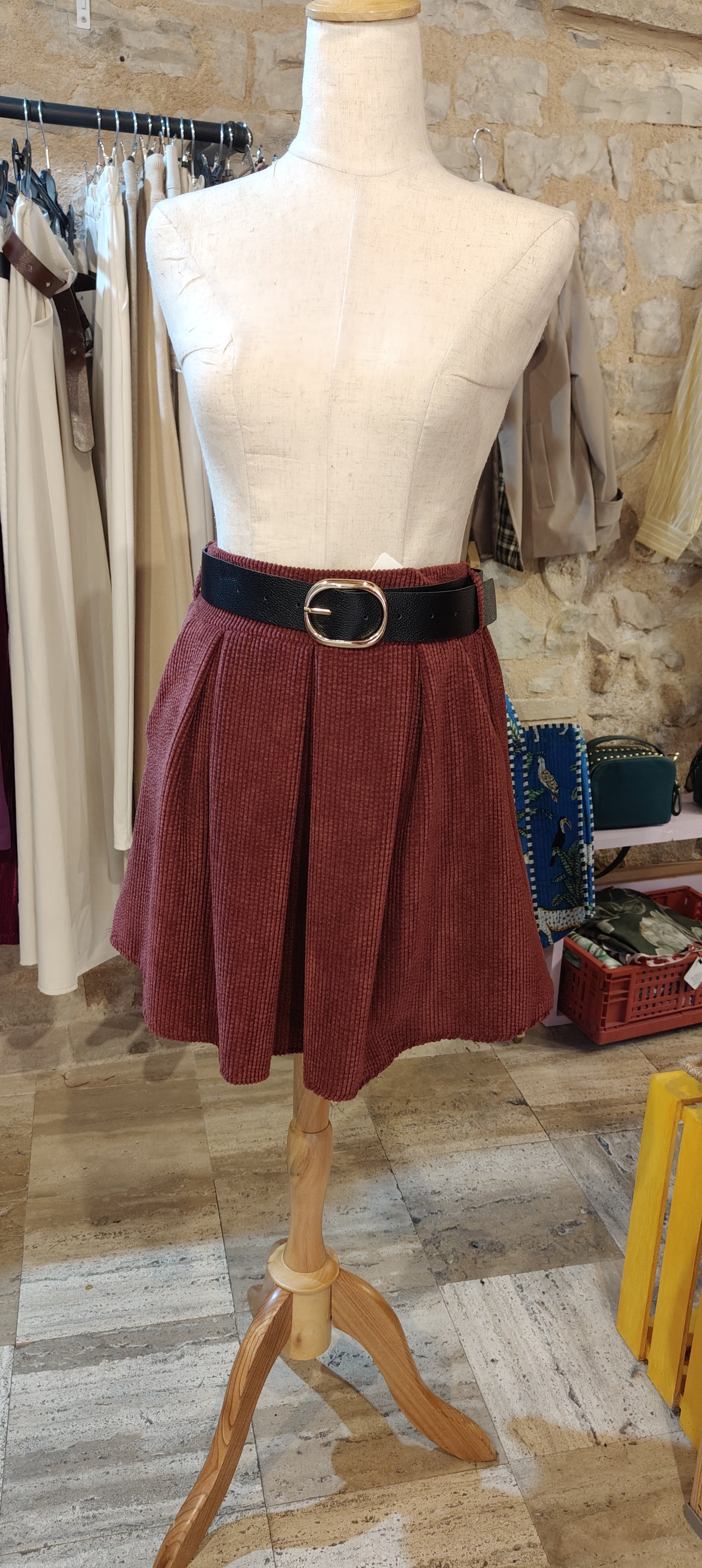 Gonna corta in costine di velluto bordeaux, con pieghe avanti e arricciatura dietro. Ha le tasche laterali e la cintura