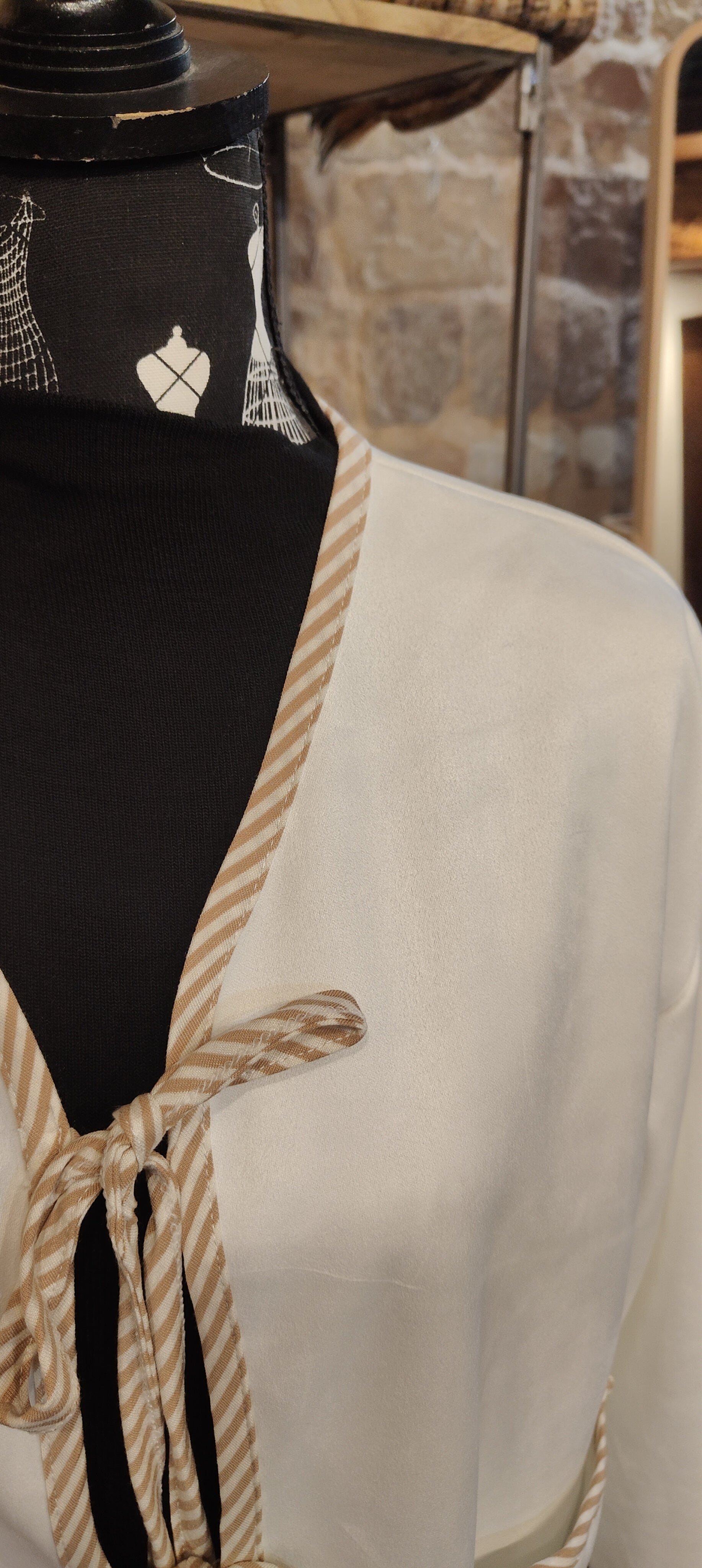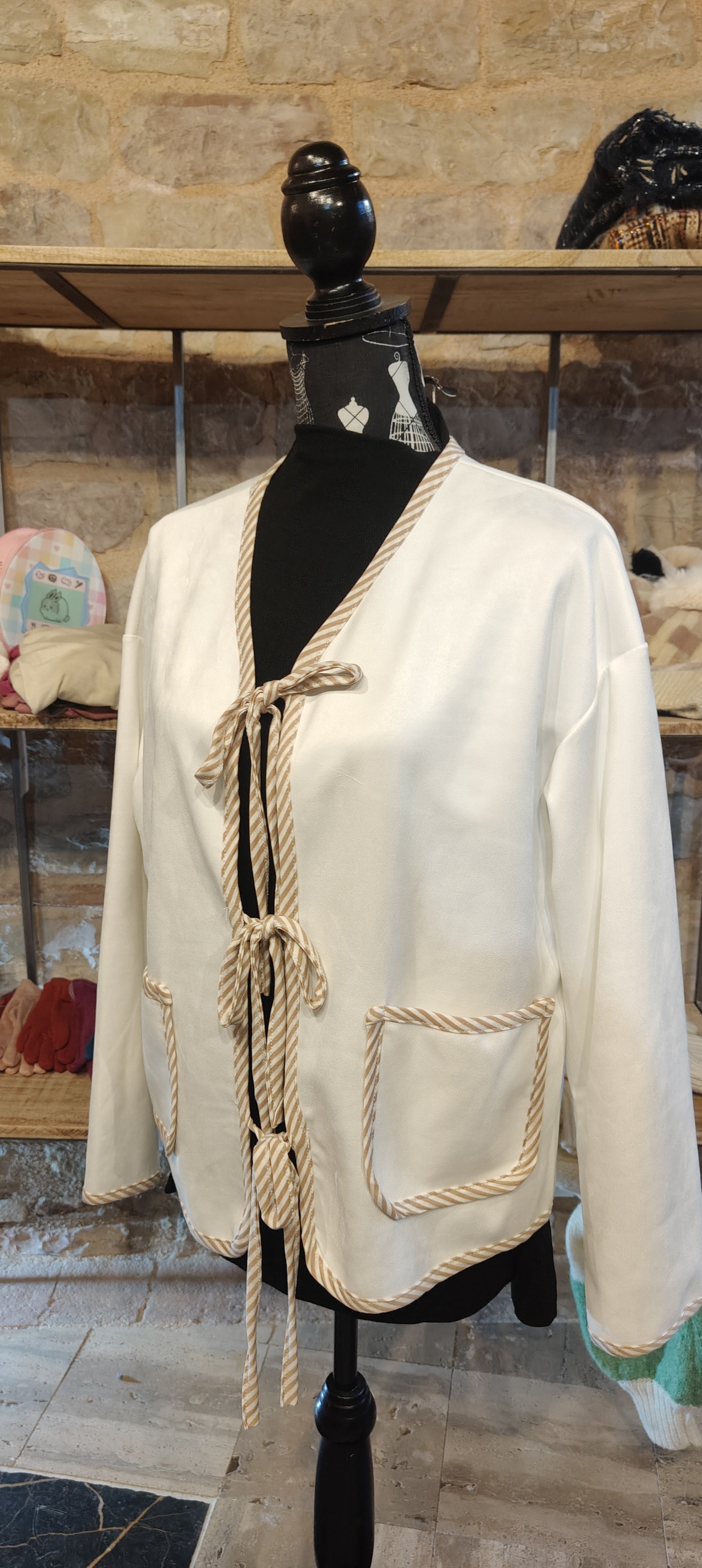Spolverino scamosciato con chiusura mediante laccetti e profilato con sbieco
